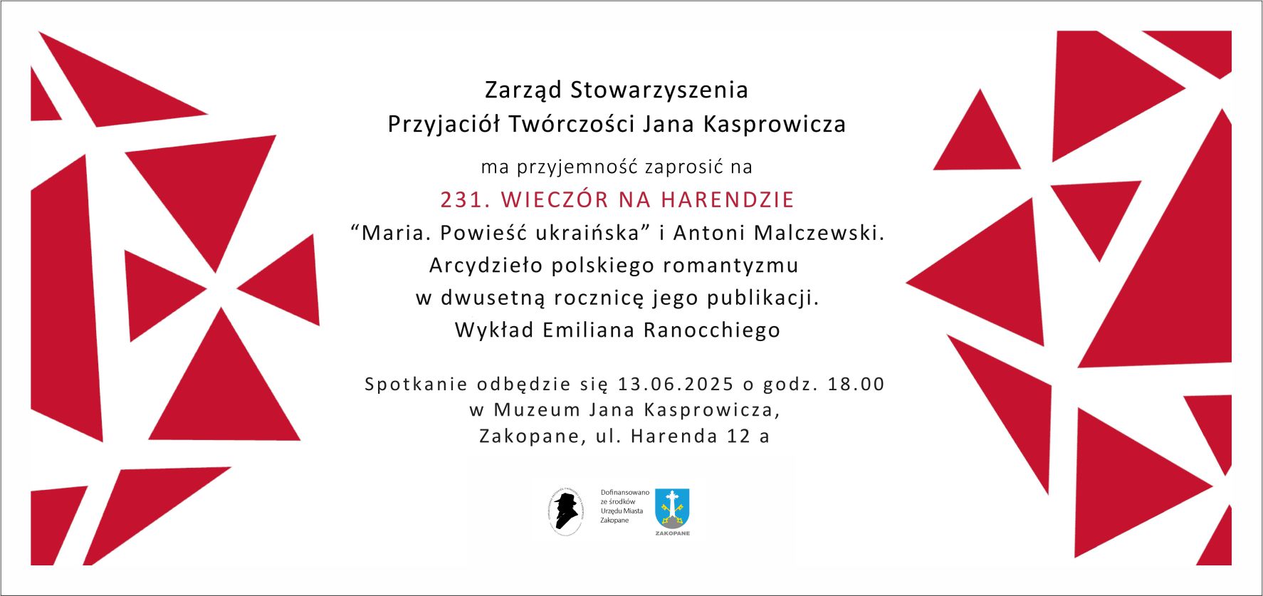 Stowarzyszenie Przyjaciół Twórczości Jana Kasprowicza zaprasza na 231. Wieczór na Harendzie „Maria. Powieść ukraińska” i Antoni Malczewski. Arcydzieło polskiego romantyzmu w dwusetną rocznicę jego publikacji.