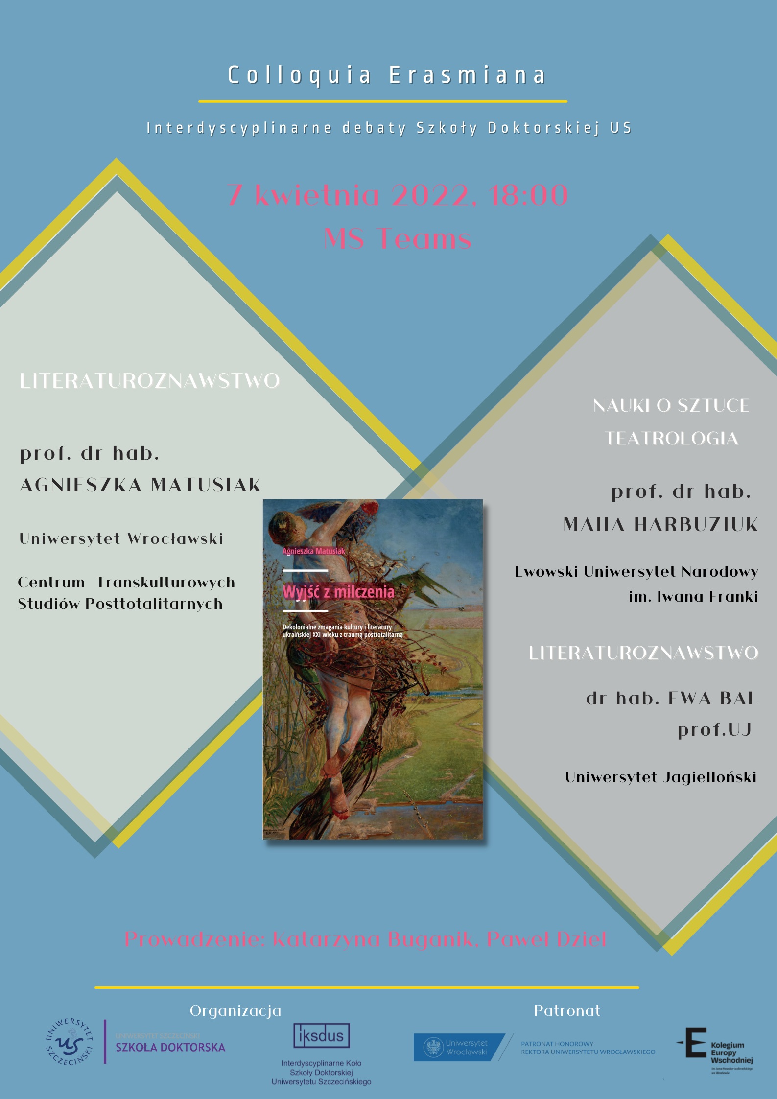 Szkoła Doktorska Uniwersytetu Szczecińskiego zaprasza na kolejne spotkanie w ramach cyklu „Colloquia Erasmiana”, tym razem wokół książki Pani Profesor Agnieszki Matusiak „Wyjść z milczenia. Dekolonialne zmagania kultury i literatury ukraińskiej XXI wieku z traumą posttotalitarną”. Debata odbędzie się 7 kwietnia br. (czwartek), o godz. 18:00 na platformie MS Teams.