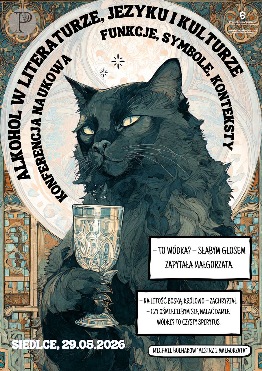 Organizatorzy zapraszają studentów, doktorantów oraz młodych badaczy i badaczki do udziału w interdyscyplinarnej konferencji naukowej poświęconej szeroko rozumianym reprezentacjom alkoholu w literaturze, języku i kulturze. Cytat z „Mistrza i Małgorzaty” Michaiła Bułhakowa, będący mottem naszego wydarzenia, ujawnia jednocześnie groteskowy, symboliczny oraz kulturowy potencjał alkoholu jako elementu wyobraźni literackiej i praktyki społecznej. Chcemy uczynić ją punktem wyjścia do refleksji nad znaczeniami, funkcjami i dyskursami związanymi z alkoholem w tekstach kultury.