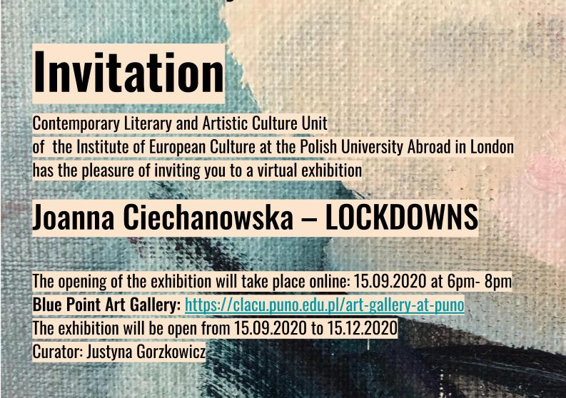 On 15.09.2020 at 6:00 pm at the Gallery’s website: https://clacu.puno.edu.pl/art-gallery-at-puno you will be able to visit a virtual exhibition of paintings by Joanna Ciechanowska, read their brief curatorial description, and buy a book about her artistic work.