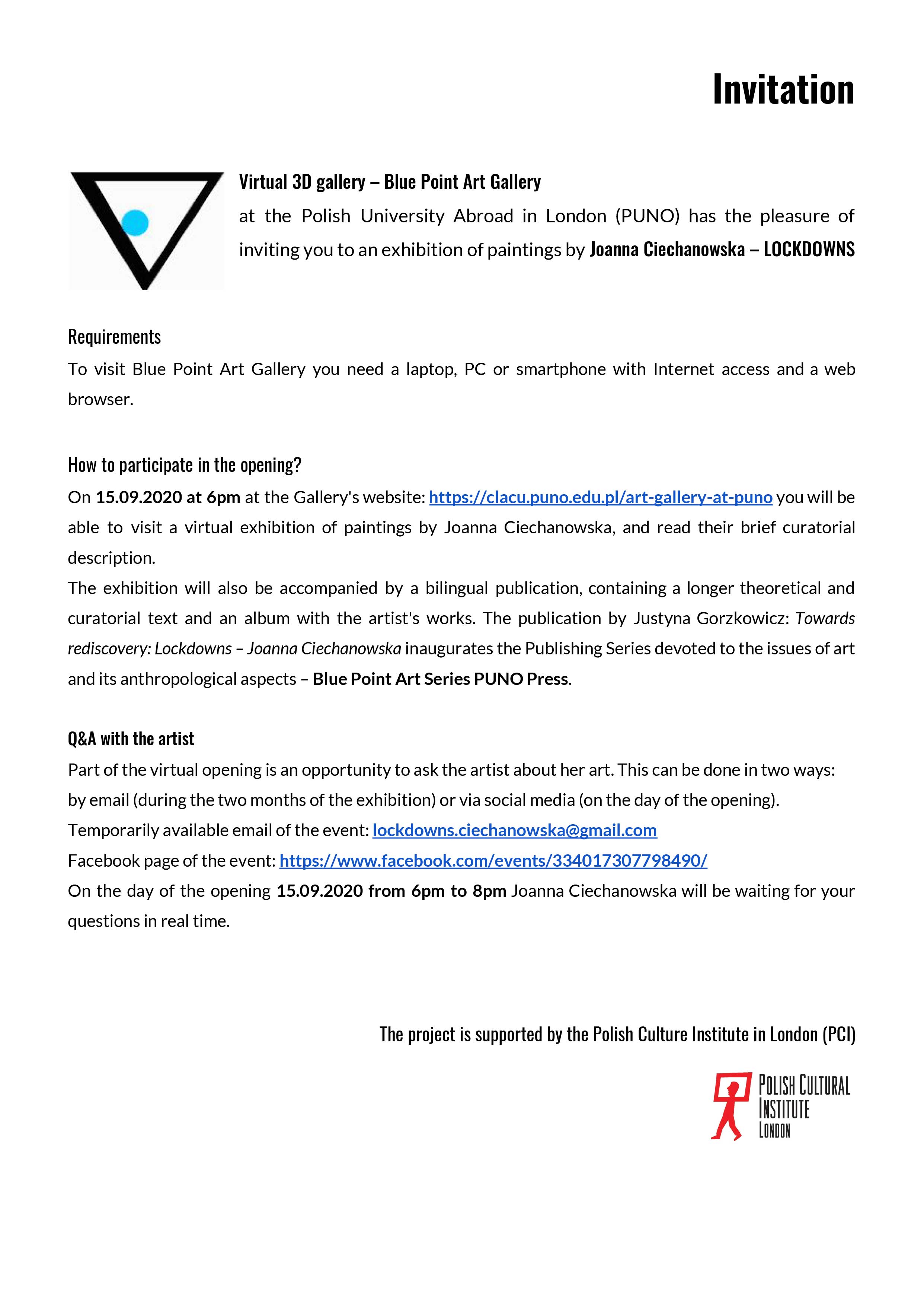 The Blue Point Art Gallery (a virtual 3D gallery), was built in a digital environment as part of a collaboration between the Contemporary Literary and Artistic Culture Unit of the Institute of European Culture at the Polish University Abroad (PUNO) and the Culture Lab Foundation. Although the gallery was created in response to the changes resulting from the Covid-19 pandemic (March-July 2020), its founders have continued this work, with the intention of transferring part of their activities to the digital world. The current pandemic made us aware of the fragility of social structures and the deep need not only to seek unconventional solutions, but also to implement them quickly.