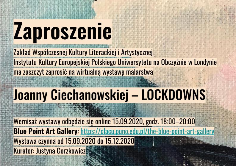 The Blue Point Art Gallery is opening with an individual exhibition by Joanna Ciechanowska, “LOCKDOWNS”. The issue of this virtual event is connected with the current pandemic situation. Further, it refers to various moments of retreat in the artist’s life and, from the universal human point of view, provides an opportunity to look at the actual problems from a broader historical and cultural perspective.