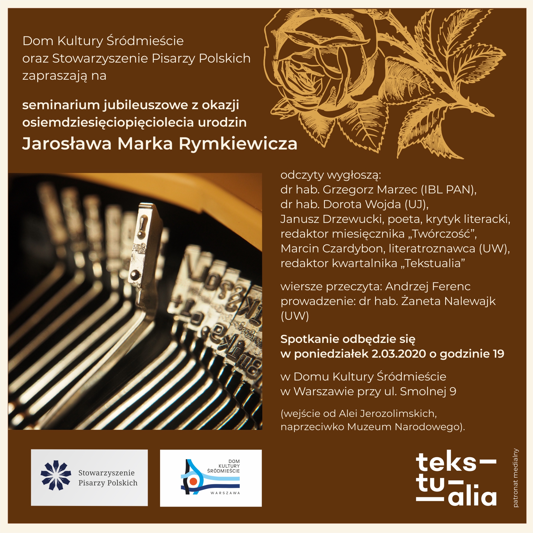 Dom Kultury Śródmieście oraz Stowarzyszenie Pisarzy Polskich zapraszają na seminarium jubileuszowe z okazji 85-lecia urodzin Jarosława Marka Rymkiewicza.