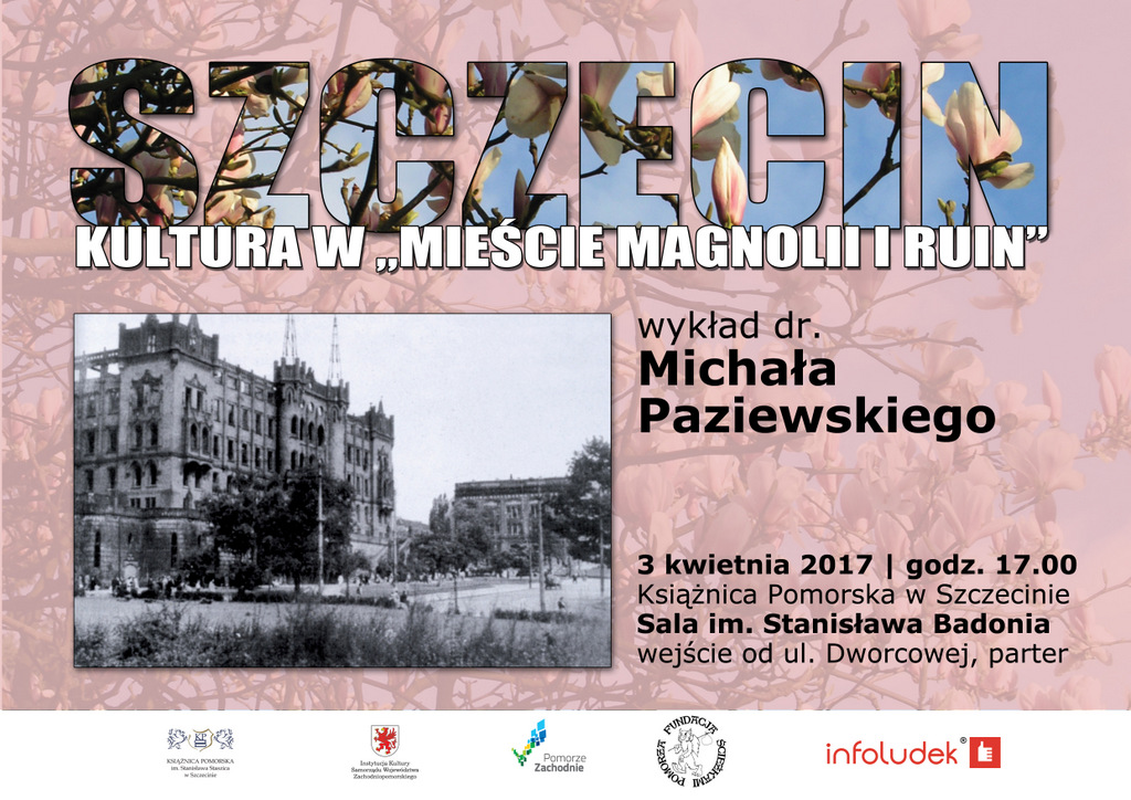 Książnica Pomorska oraz Fundacja Ścieżkami Pomorza zapraszają na wykład dr. Michała Paziewskiego Szczecin – kultura w „mieście magnolii i ruin” (poniedziałek 3 kwietnia 2017 o godz. 17.00, Sala im. Stanisława Badonia, wejście od ul. Dworcowej, parter). Wstęp wolny.