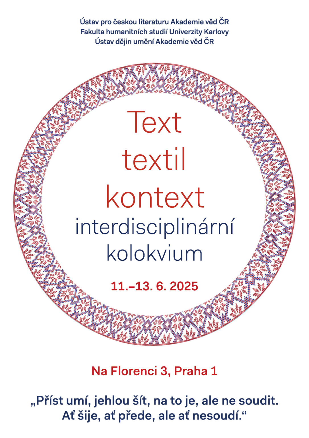 Chcielibyśmy zaprosić Państwa na interdyscyplinarne kolokwium „Text, textil, kontext“ („Tekst, tkanina, kontekst”), które odbędzie się w dniach 11–13 czerwca 2025 r. w Instytucie Literatury Czeskiej Akademii Nauk Republiki Czeskiej w Pradze.