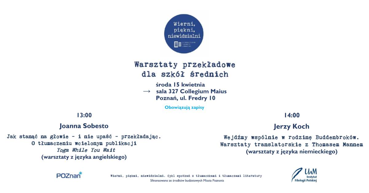 Stowarzyszenie Tłumaczy Literatury w ramach cyklu "Wierni, piękni niewidzialni" zaprasza na bezpłatne godzinne warsztaty przekładowe dla uczennic i uczniów szkół średnich, które odbędą się w środę 15 kwietnia o 13:00 oraz o 14:00 w poznańskim Collegium Maius przy ulicy Fredry 10.