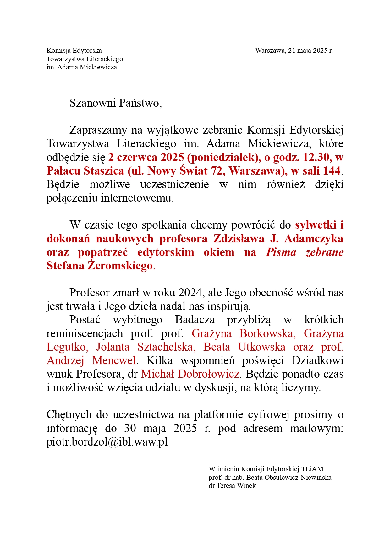Komisja Edytorska Towarzystwa Literackiego im. Adama Mickiewicza zaprasza na zebranie, które odbędzie się 5 czerwca 2017 (poniedziałek), o godz. 12.00 w Pałacu Staszica (Warszawa, ul. Nowy Świat 72, s. 144).