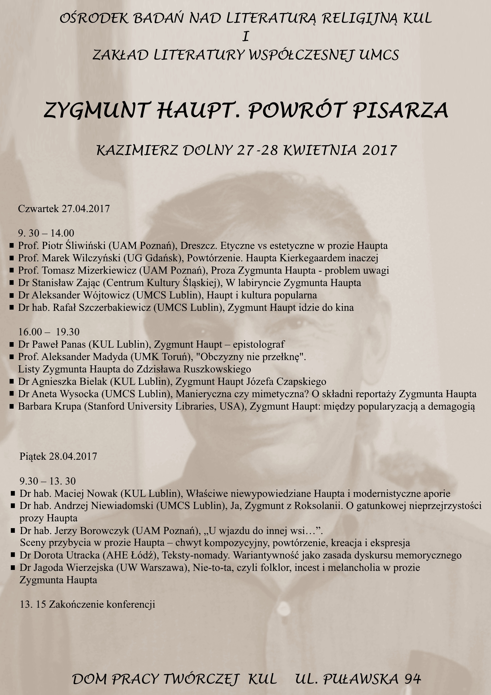 Ośrodek Badań nad Literaturą Religijną KUL oraz Zakład Literatury Współczesnej UMCS zapraszają na konferencję naukową „Zygmunt Haupt. Powrót pisarza”, która odbędzie się 27-28 kwietnia 2017 r. w Kazimierzu Dolnym (Dom Pracy Twórczej KUL, ul. Puławska 94).