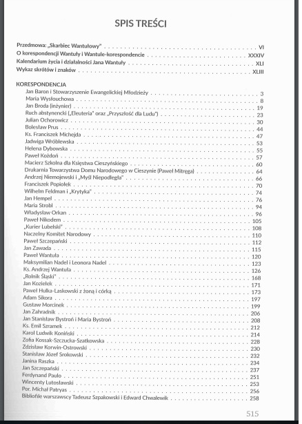 Korespondencja Wantuły pokazuje ogrom i wielowątkowość jego działalności, a zarazem ujawnia, że był wytrawnym epistolografem, wnikliwym i wrażliwym, o szerokich horyzontach. Nie zasklepiał się na śląskim podwórku, lecz wybiegał dalej, ku pokrewnym duszom myślącym w sposób niepodległy, jak Maria Wysłouchowa, Julian Ochorowicz, Andrzej Niemojewski czy Rafał Urban. Wśród adresatów i nadawców listów zawartych w tomie znajdują się też luminarze nauki i kultury (m.in. Jan Stanisław Bystroń, Wincenty Lutosławski, Stanisław Pigoń, Irena Krzywicka, Kazimierz Wyka, Tadeusz Mikulski), pisarze i publicyści (Władysław Orkan, Gustaw Morcinek, Zofia Kossak-Szczucka, Karol Ludwik Koniński, Paweł Hulka-Laskowski), światli ewangeliccy i katoliccy księża […]. Ważną pozycję w zbiorze mają syn Wantuły Andrzej, późniejszy zwierzchnik polskiego Kościoła Ewangelicko-Augsburskiego, i chrześniak Jan Szczepański, wybitny socjolog. Ustroński bibliofil dzieli się z ludźmi przemyśleniami oraz plonami swojego sadu – śle im zarówno listy i książki, jak i paczki z jabłkami […].