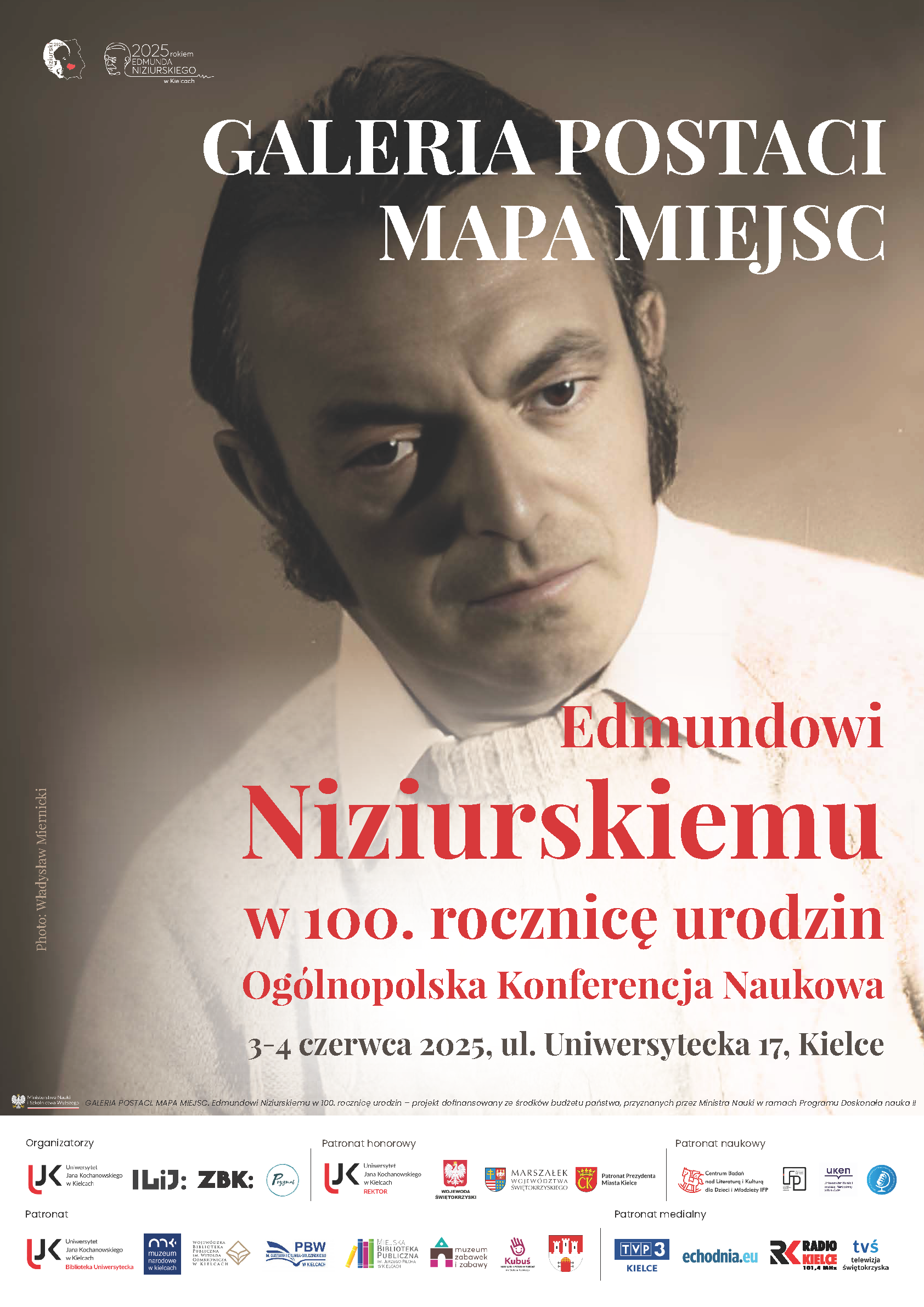 Instytut Literaturoznawstwa i Językoznawstwa UJK w Kielcach, Zakład Badań Kulturowych ILiJ, Literaturoznawcze Koło Naukowe „Pryzmat” zapraszają na Ogólnopolską Konferencję Naukową pod honorowym patronatem JM Rektor UJK prof. dr hab. Beaty Wojciechowskiej, Wojewody Świętokrzyskiego Józefa Bryka, Marszałek Województwa Świętokrzyskiego Renaty Janik, Prezydent Miasta Kielce Agaty Wojdy GALERIA POSTACI. MAPA MIEJSC. Edmundowi Niziurskiemu w 100. rocznicę urodzin, która odbędzie się w dniach 3-4 czerwca 2025 w Kielcach.