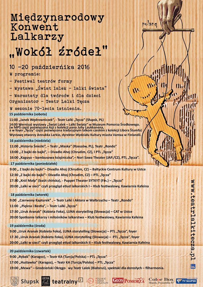 Serdecznie zapraszamy do udziału w Międzynarodowym Konwencie Lalkarzy „WOKÓŁ ŹRÓDEŁ”, którego organizatorem jest Państwowy Teatr Lalki „Tęcza” w Słupsku (Słupsk-Ustka 10-20 października 2016 roku).