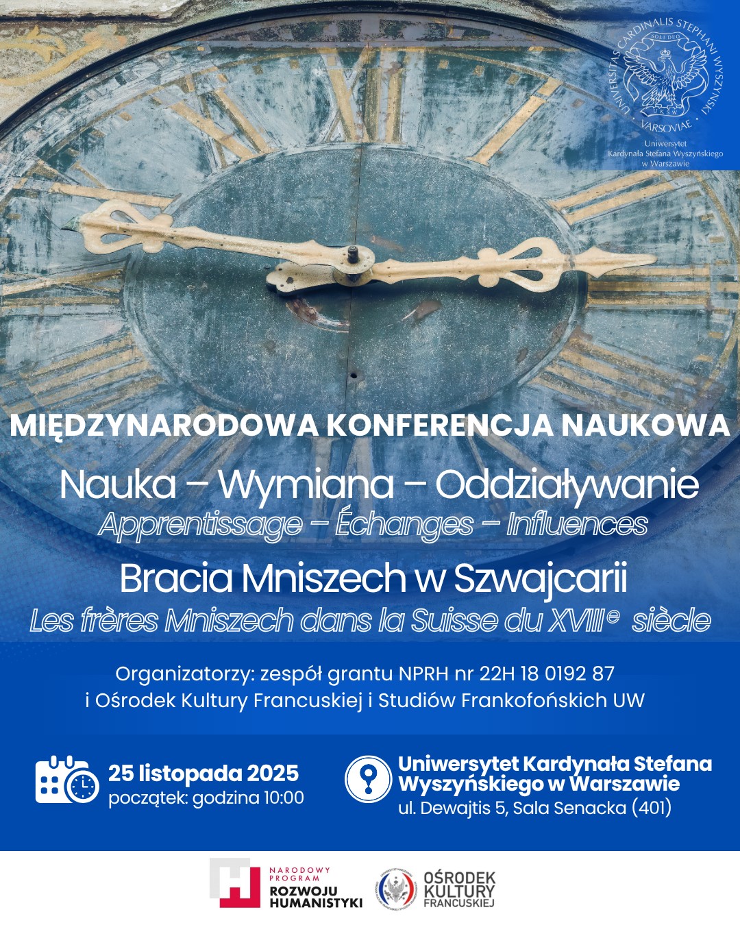 Konferencja powstała w ramach projektu grantowego NPRH nr 22H 18 0192 87 pt. „Bracia Mniszech a Description des montagnes et des vallées qui font partie de la Principauté de Neuchatel et Valangin. Od rękopisu (1764) przez wersje francuskie po poszerzoną edycję niemiecką. Geneza i historia tekstu oraz polski przekład całości”, kierowanego przez doc. dra Jana Zielińskiego, em. profesora UKSW. Współorganizatorem jest Ośrodek Kultury Francuskiej i Studiów Frankofońskich UW. Wśród referentów są specjaliści z różnych ośrodków akademickich krajowych (UW, UŁ, Zamek Królewski) oraz ze Szwajcarii romańskiej.