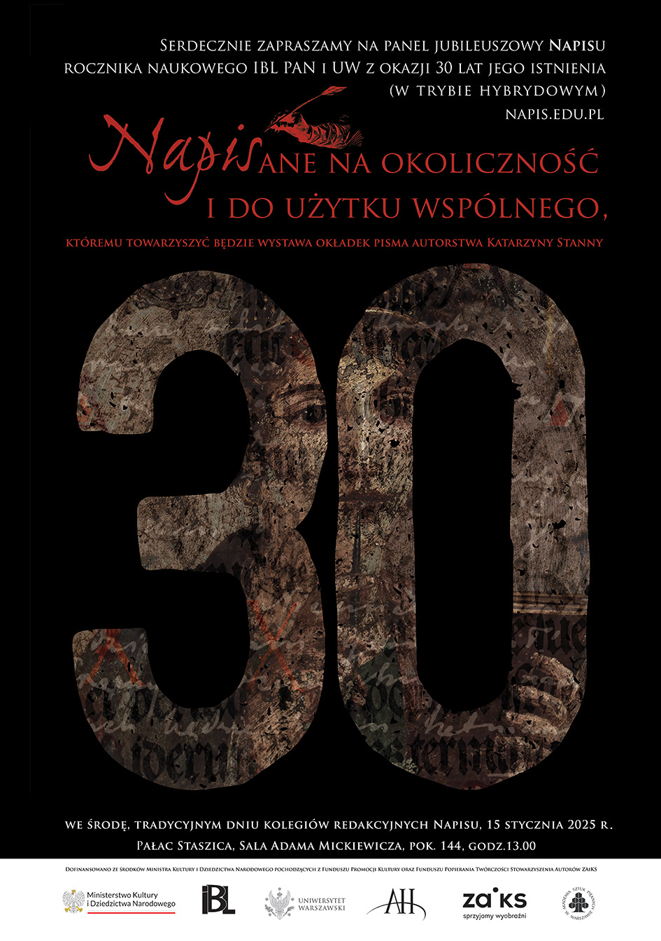 Serdecznie zapraszamy na panel jubileuszowy „Napisu”, rocznika naukowego IBL PAN i UW, z okazji 30 lat jego istnienia (w trybie hybrydowym) „NAPISane na okoliczność i do użytku wspólnego”, któremu towarzyszyć będzie wystawa okładek autorstwa Katarzyny Stanny.