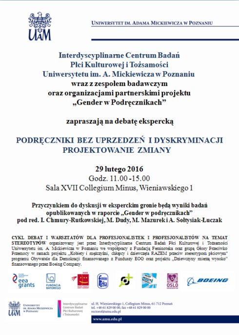 Interdyscyplinarne Centrum Badań Płci Kulturowej i Tożsamości wraz z zespołem badawczym oraz organizacjami partnerskimi projektu „Gender w podręcznikach” zapraszają na debatę ekspercką „Podręczniki bez uprzedzeń i dyskryminacji. Projektowanie zmiany”, która odbędzie się 29 lutego 2016 r. w godz. 11.00–15.00 w Poznaniu (sala XVII Collegium Minus). Więcej informacji na www.gender.amu.edu.pl oraz na plakacie.