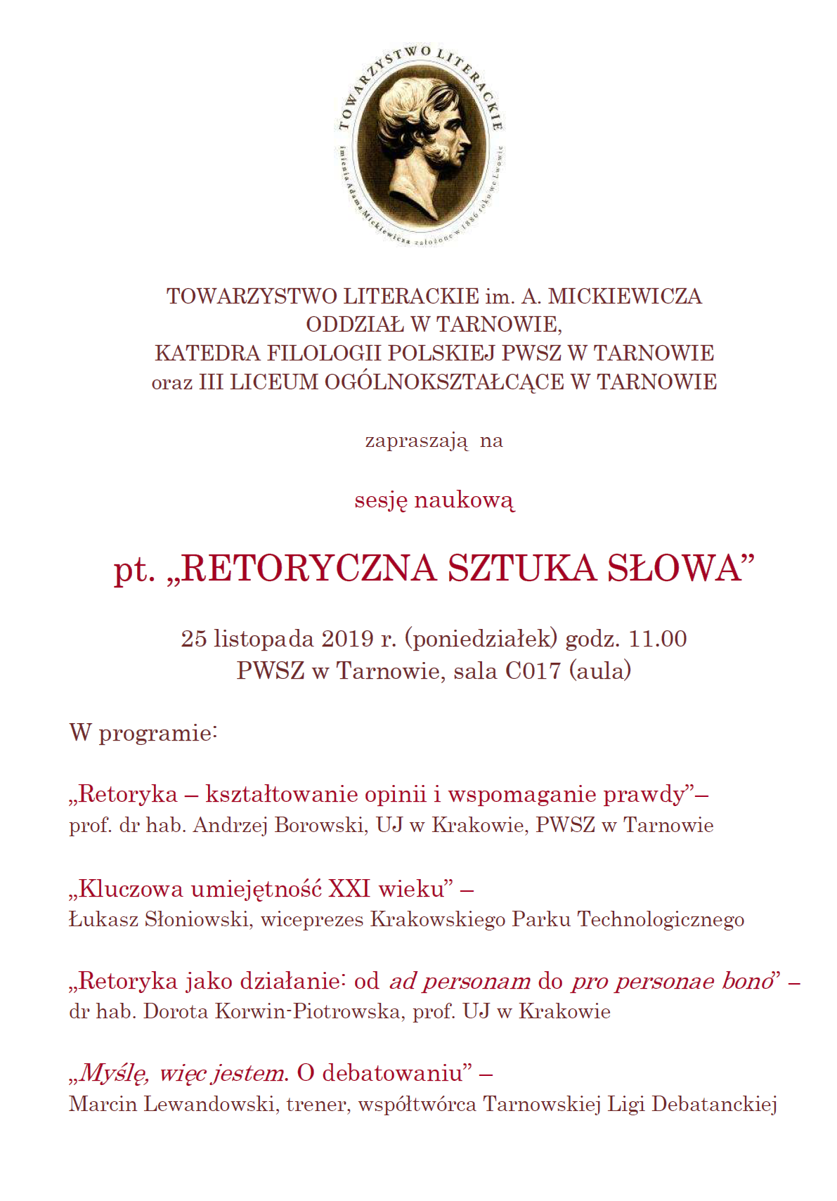 25 listopada 2019 roku w Państwowej Wyższej Szkole Zawodowej w Tarnowie odbędzie się sesja naukowa Retoryczna sztuka słowa.