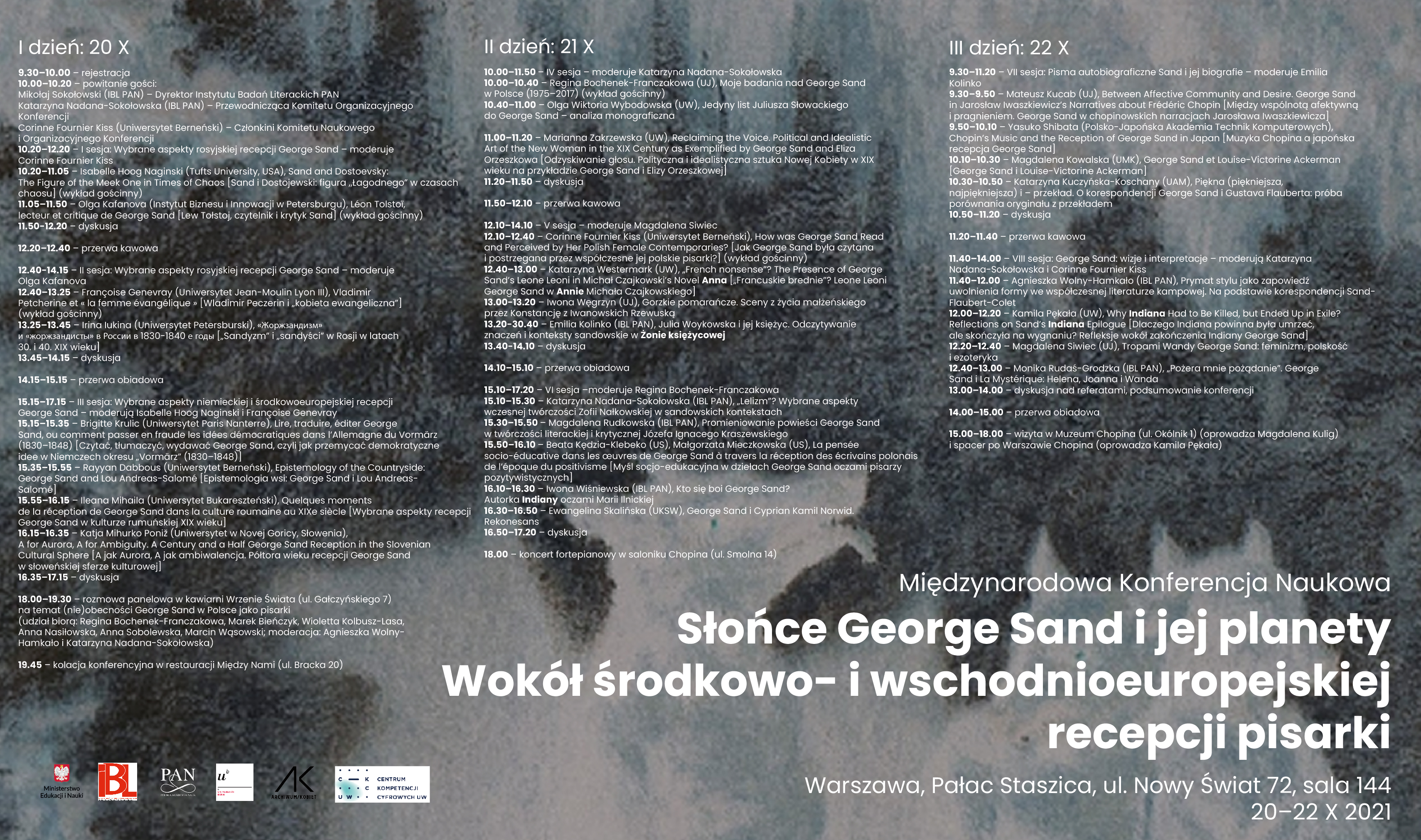 - 15.30–15.50 – Magdalena Rudkowska (IBL PAN), Promieniowanie powieści George Sand w twórczości literackiej i krytycznej Józefa Ignacego Kraszewskiego