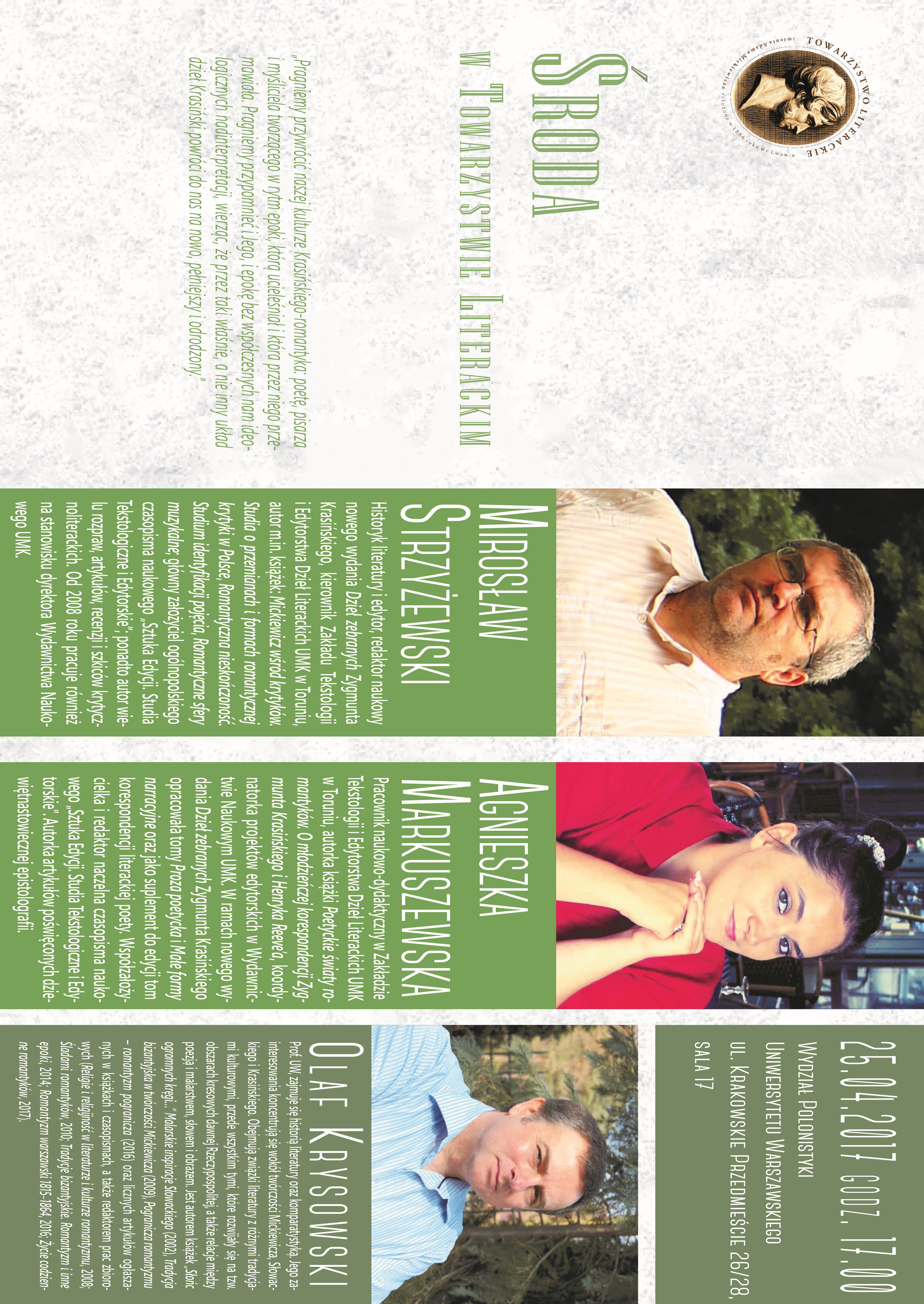 Zarząd Warszawskiego Oddziału Towarzystwa Literackiego im. Adama Mickiewicza zaprasza na kolejne spotkanie z cyklu „Środa w Towarzystwie Literackim”. Prof. Mirosław Strzyżewski oraz dr Agnieszka Markuszewska przedstawią nową edycję Dzieł zebranych Zygmunta Krasińskiego.