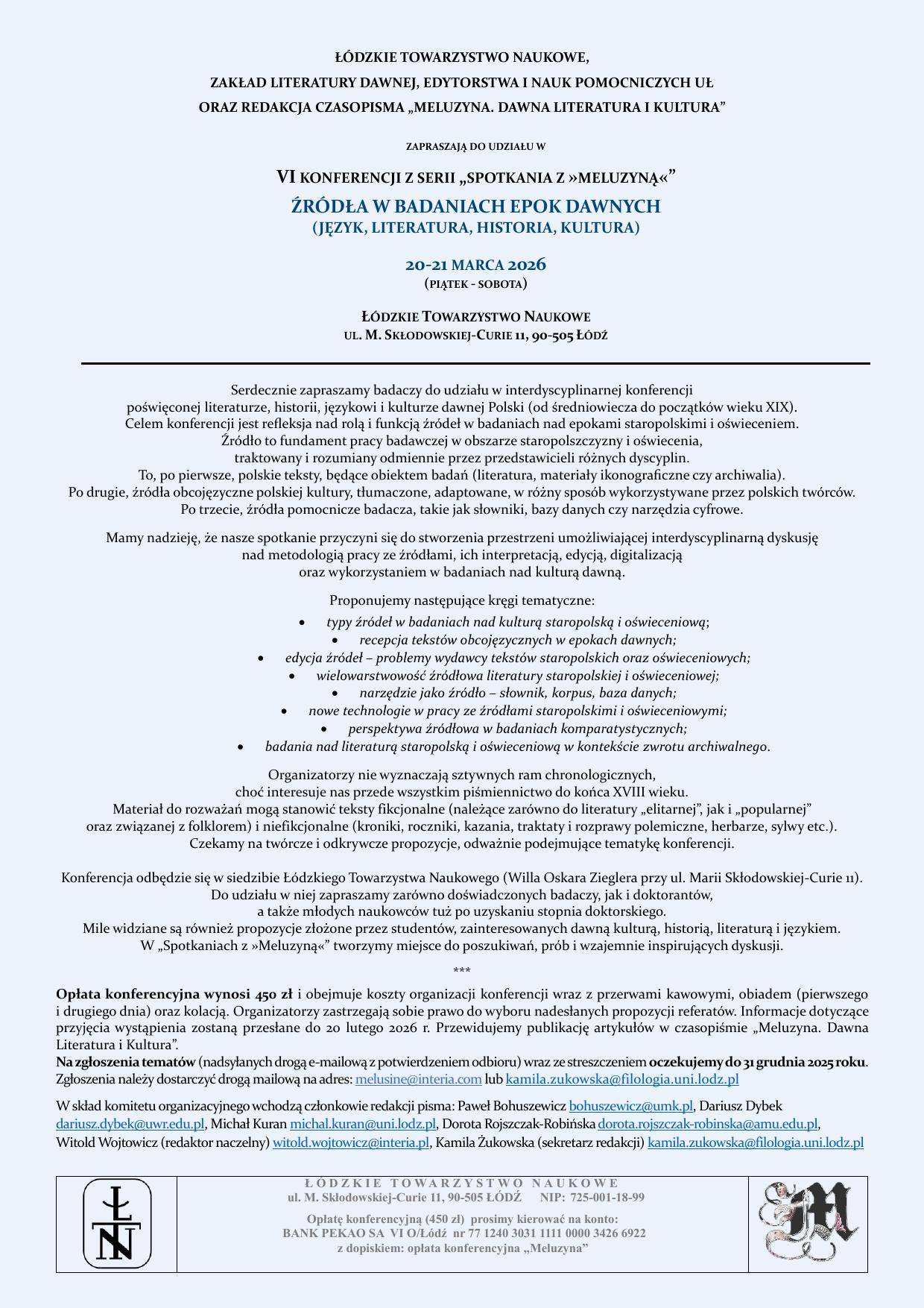 „Łódzkie Towarzystwo Naukowe, Instytut Filologii Polskiej UŁ oraz Redakcja czasopisma „Meluzyna. Dawna Literatura i Kultura” zapraszają do udziału w konferencji „Źródła w badaniach epok dawnych (język, literatura, historia, kultura)".