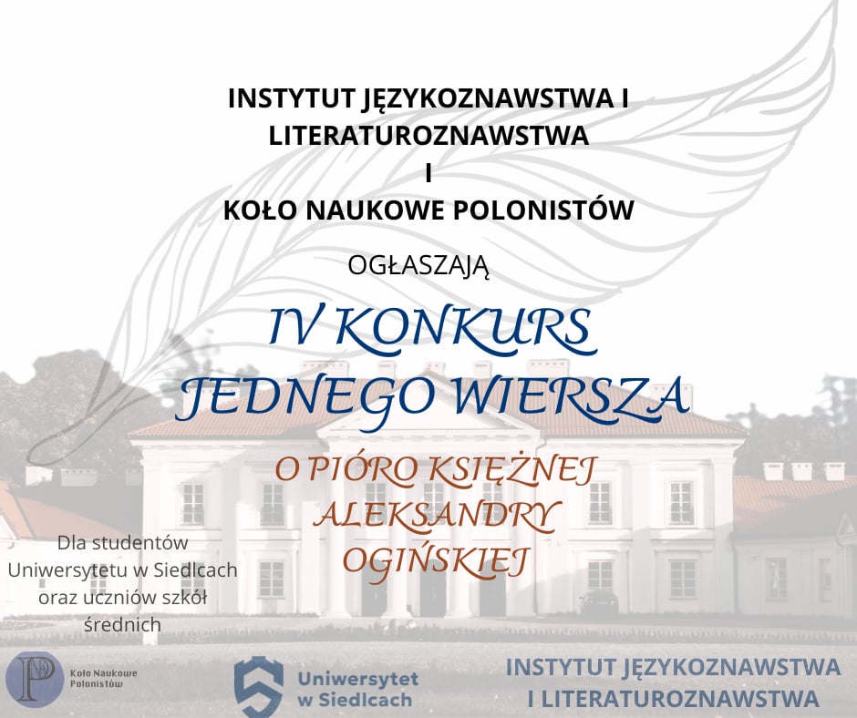 Instytut Językoznawstwa i Literaturoznawstwa oraz Koło Naukowe Polonistów ogłaszają IV Konkurs Jednego Wiersza o Pióro Księżnej Aleksandry Ogińskiej dla studentów Uniwersytetu w Siedlcach oraz uczniów szkół średnich w wieku 15-20 lat z powiatów: siedleckiego, łosickiego, sokołowskiego, węgrowskiego, mińskiego, garwolińskiego, bialskiego i łukowskiego oraz miast Siedlce i Biała Podlaska.