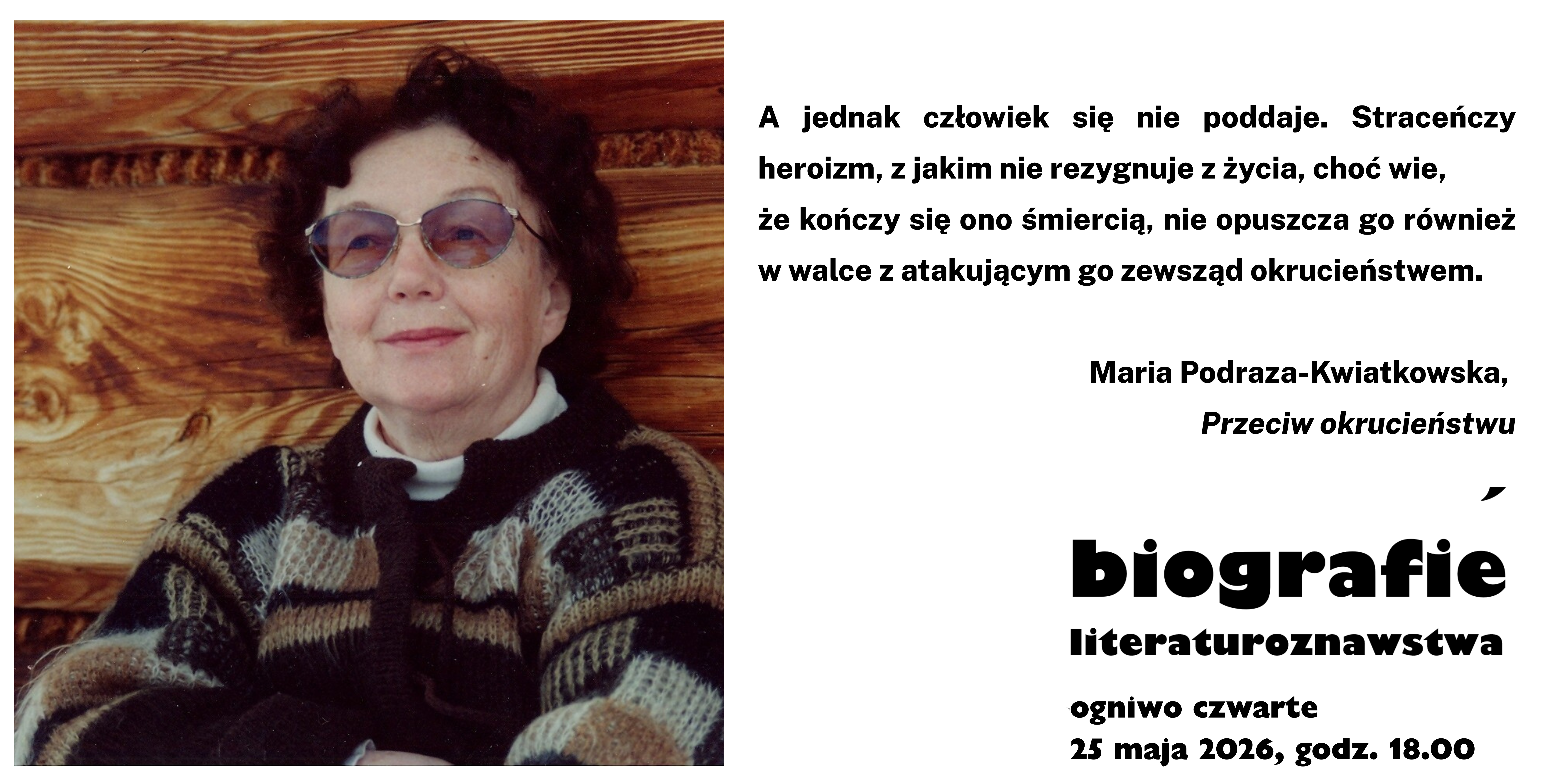 Pani Profesor Maria Podraza-Kwiatkowska będzie bohaterką kolejnego seminarium z cyklu "biografie literaturoznawstwa", które odbędzie się 25 maja 2026 roku o godzinie 18.00 na platformie Google Meet i będzie transmitowane na platformie YouTube oraz utrwalone w formie cyfrowej.