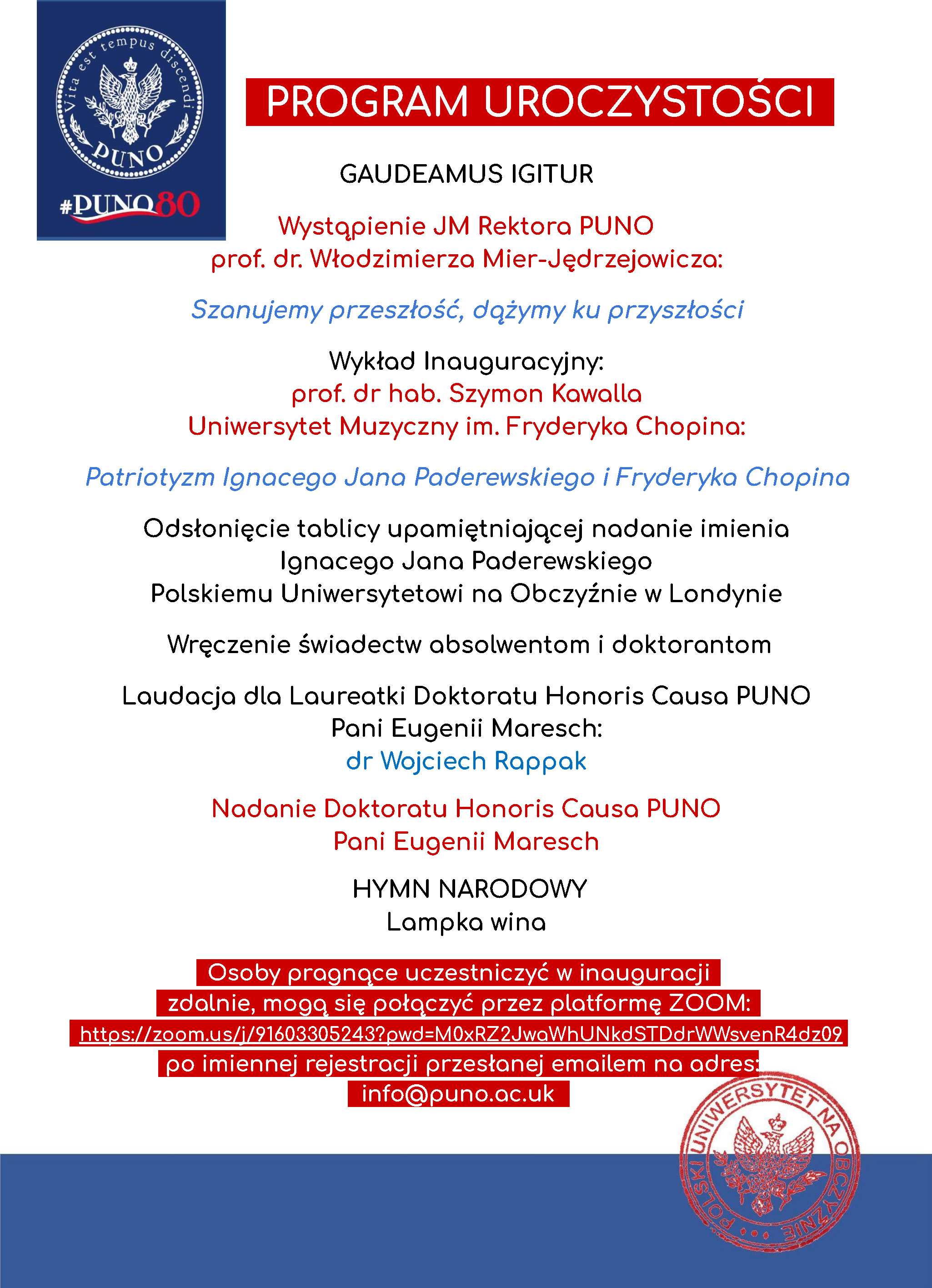 Rektor Polskiego Uniwersytetu na Obczyźnie w Londynie - PUNO, prof. dr Włodzimierz Mier-Jędrzejowicz oraz Senat Uczelni serdecznie zapraszają na Inaugurację Roku Akademickiego 2021/2022, podczas której odbędzie się nadanie Pani Eugenii Maresch tytuły Doktora Honoris Causa PUNO.