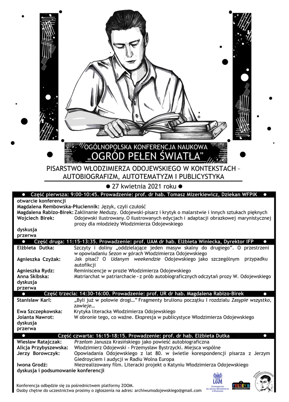 Zespół Archiwum Włodzimierza Odojewskiego na Wydziale Filologii Polskiej i Klasycznej UAM zaprasza na konferencję „Ogród pełen światła”. Pisarstwo Włodzimierza Odojewskiego w kontekstach – autobiografizm, autotematyzm i publicystyka. Obrady odbędą się formie zdalnej 27 kwietnia 2021.