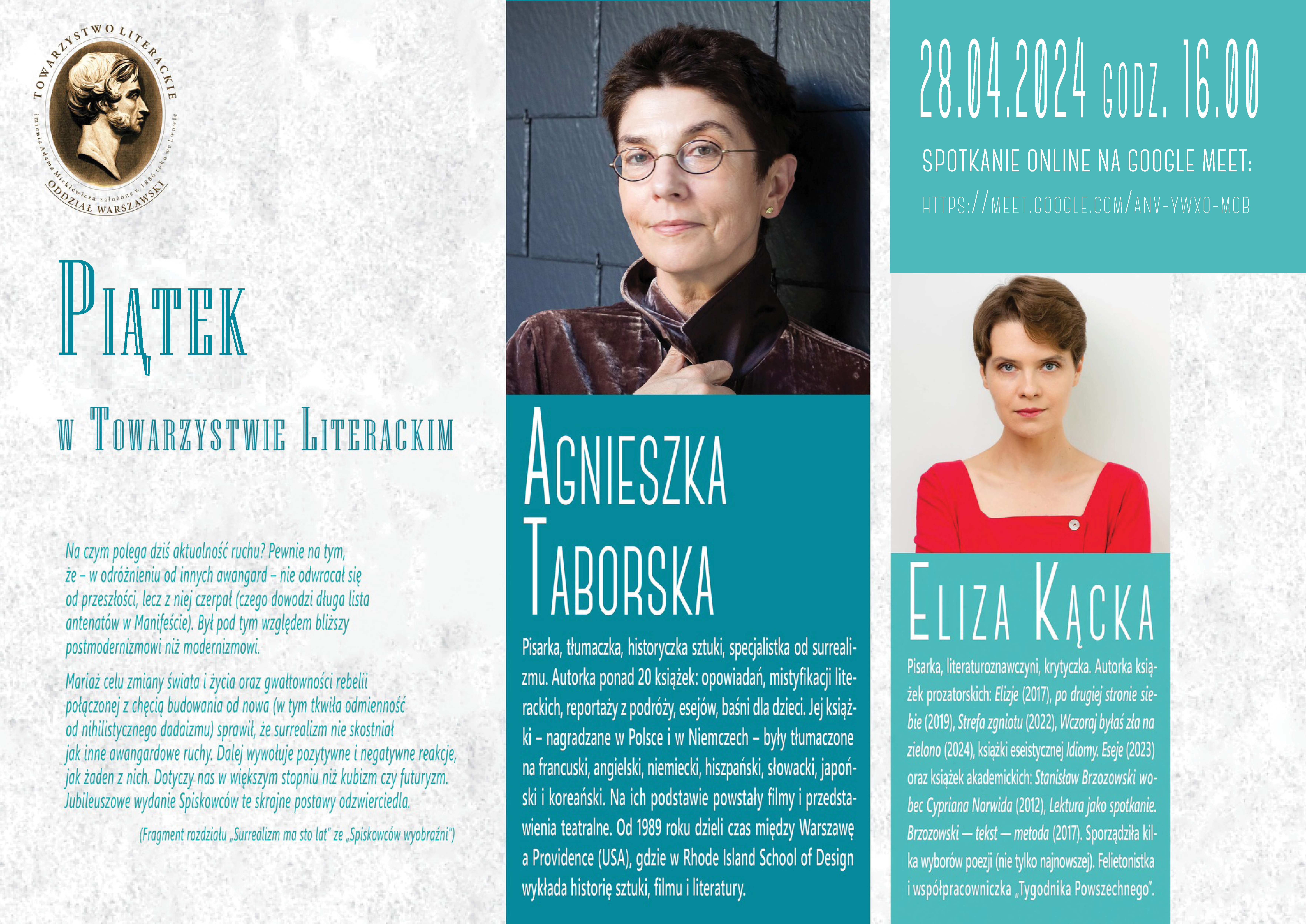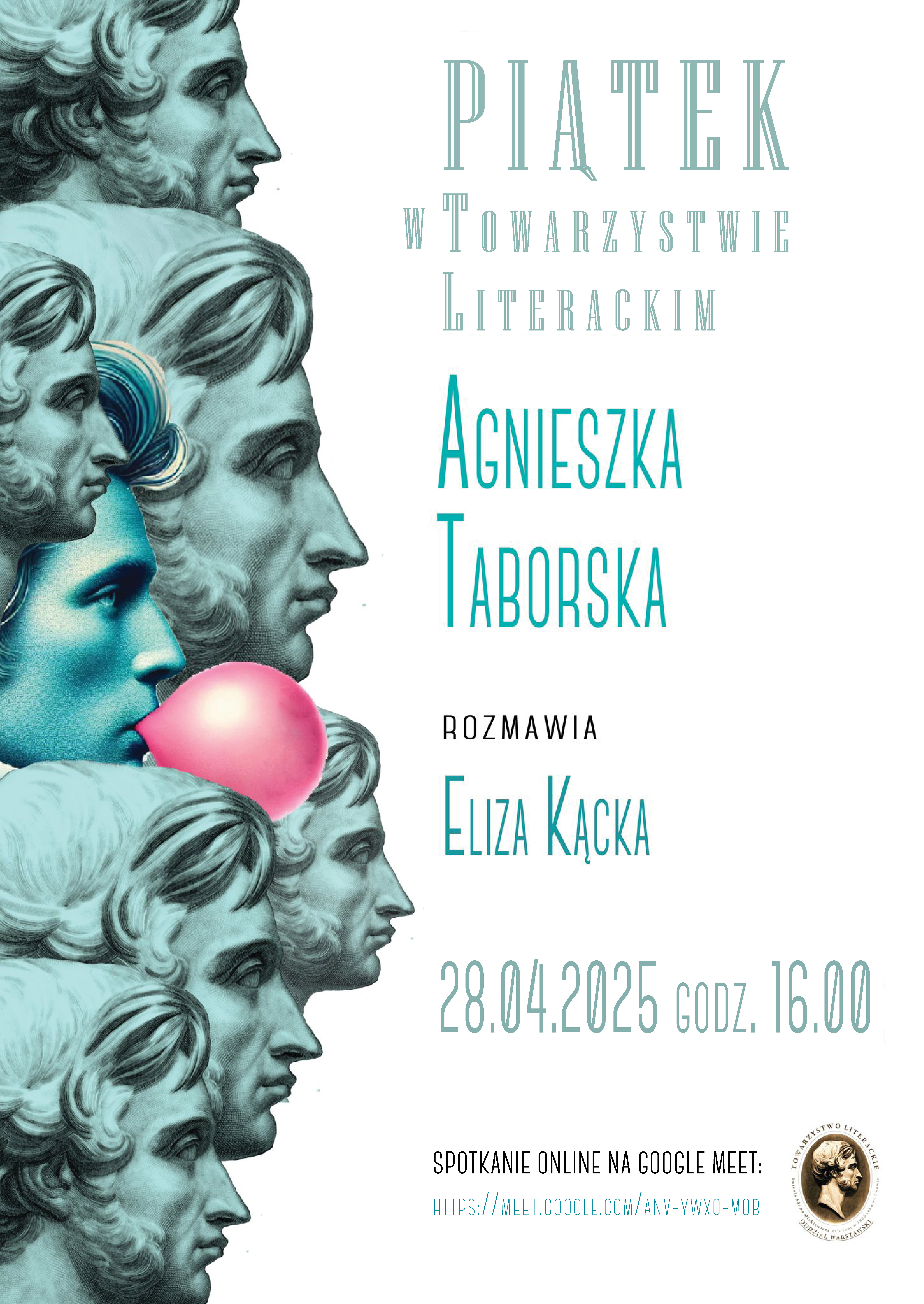 Zarząd Warszawskiego Oddziału Towarzystwa Literackiego im. Adama Mickiewicza zaprasza na Piątek w Towarzystwie Literackim z Agnieszką Taborską.