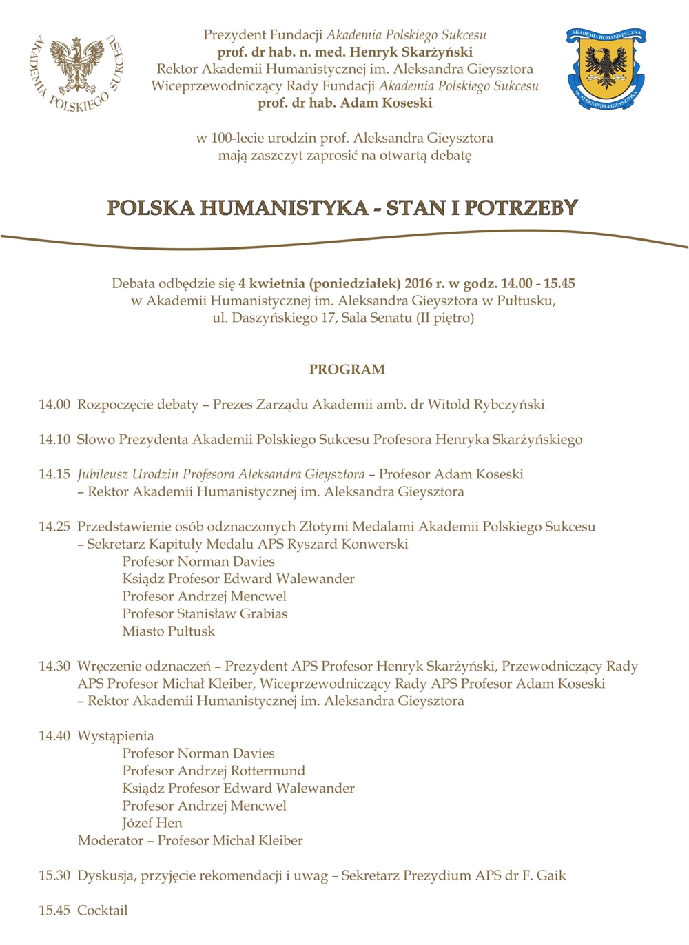 Zapraszamy na otwartą debatę "Polska Humanistyka - stan i potrzeby" organizowaną przez Akademię Humanistyczną im. Aleksandra Gieysztora w Pułtusku. Debata odbędzie się 4 kwietnia 2016 roku.