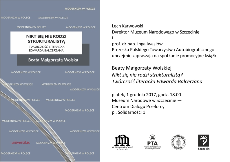 Zapraszamy na spotkanie promujące książkę „Nikt się nie rodzi strukturalistą. Twórczość literacka Edwarda Balcerzana” autorstwa dr Beaty M. Wolskiej. Spotkanie odbędzie się w piątek, 1 grudnia 2017 roku o godzinie 18.00 w „Przestrzeni Dialogu” (poziom –1) Muzeum Narodowego w Szczecinie – Centrum Dialogu Przełomy przy pl. Solidarności 1. Moderatorem będzie dr Sławomir Iwasiów. Wstęp wolny.