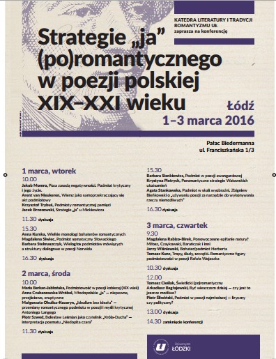 Zapraszamy do wzięcia udziału w konferencji Strategie "ja" poromantycznego w poezji polskiej XIX-XXI wieku organziowanej przez Katedrę Literatury i Tradycji Romamtyzmu UŁ.