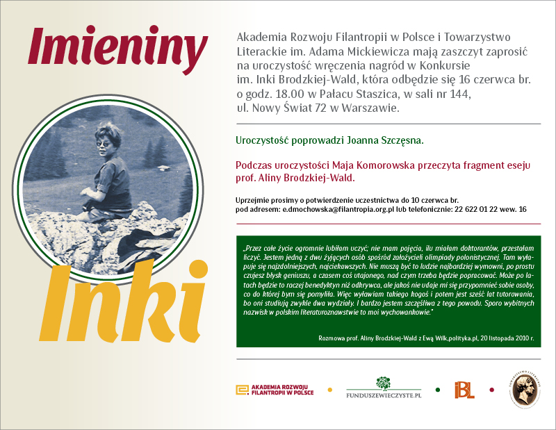 Akademia Rozwoju Filantropii w Polsce i Towarzystwo Literackie im. Adama Mickiewicza mają zaszczyt zaprosić na uroczystość wręczenia nagród w Konkursie im. Inki Brodzkiej-Wald, która odbędzie się 16 czerwca br. o godz. 18.00 w Pałacu Staszica, w sali nr 144, ul. Nowy Świat 72 w Warszawie.
