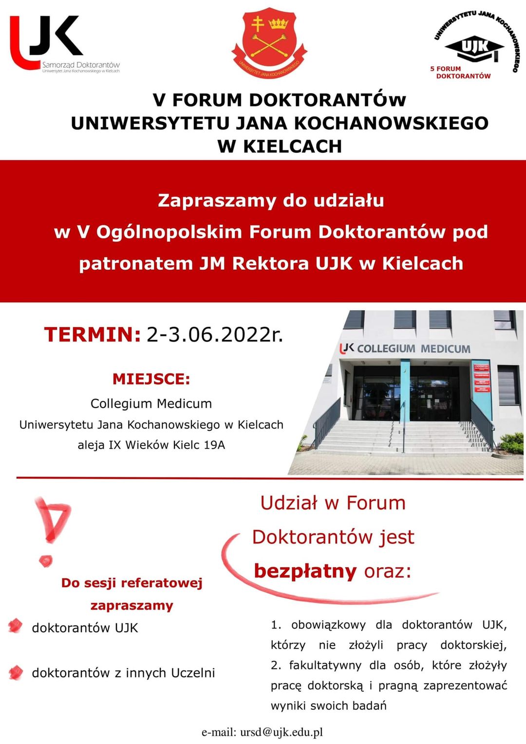 Uczelniana Rada Samorządu Doktorantów wraz ze Szkołą Doktorską Uniwersytetu Jana Kochanowskiego w Kielcach z ogromną radością serdecznie zaprasza wszystkich doktorantów do udziału w V Ogólnopolskim Forum Doktorantów pod patronatem JM Rektora prof. dr. hab. Stanisława Głuszka. Spotkanie odbędzie się 2 i 3 czerwca 2022 r. w Collegium Medicum Uniwersytetu Jana Kochanowskiego w Kielcach. Do sesji referatowej i wystąpień naukowych zapraszamy doktorantów UJK oraz doktorantów z innych Uczelni.