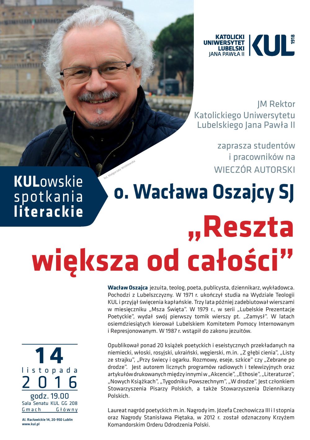 Serdecznie zapraszamy na wieczór autorski o. Wacława Oszajcy, który odbędzie się w poniedziałek 14 listopada 2016 r. o godz. 19.00 w Sali Senatu KUL (Gmach Główny GG-208). O. Wacław Oszajca to absolwent KUL, teolog, publicysta i poeta, laureat wielu nagród poetyckich.