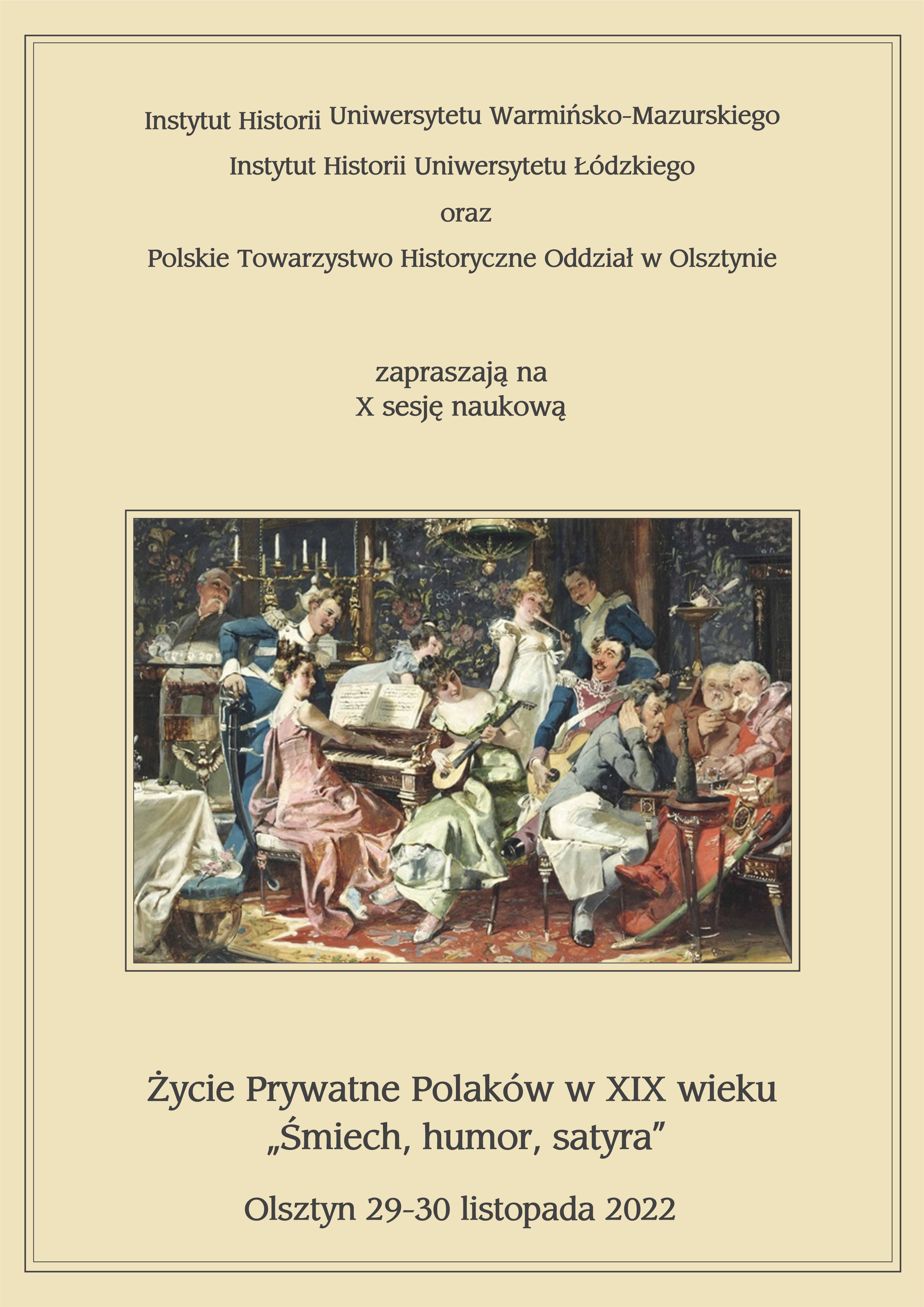 Instytut Historii Uniwersytetu Warmińsko-Mazurskiego w Olsztynie, Instytut Historii Uniwersytetu Łódzkiego oraz Polskie Towarzystwo Historyczne Oddział w Olsztynie zapraszają do udziału w X sesji naukowej Życie prywatne Polaków w XIX wieku. Śmiech, humor, satyra, która odbędzie się w dniach 29-30 listopada 2022 r. w Olsztynie.