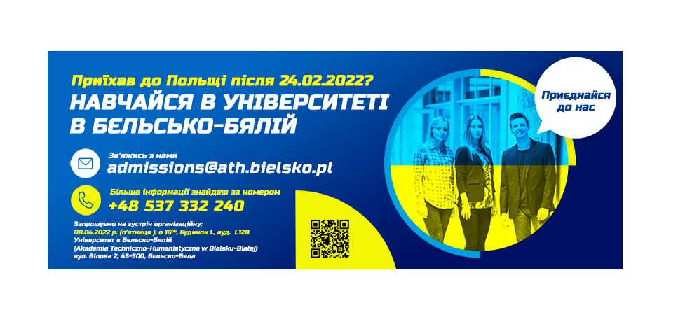 Informujemy potencjalnych kandydatów z Ukrainy o możliwości podjęcia studiów pierwszego stopnia (licencjackich) i/lub drugiego stopnia (magisterskich) na kierunku filologia polska w Akademii Techniczno-Humanistycznej w Bielsku-Białej - specjalność nauczycielska lub projektowanie komunikacji, lub dziennikarstwo obywatelskie (wybór tej dodatkowej specjalności od roku akademickiego 2023/2024, po pierwszym roku studiów). Chętnie przyjmiemy każdą osobę zainteresowaną studiami polonistycznymi i kulturą Polski. Kandydatom gwarantujemy miejsca w Domu Studenckim i wsparcie materialne w ramach pomocy stypendialnej. Bielska polonistyka jest kameralna, panuje u nas dobra atmosfera, a w samym mieście na długo przed wybuchem wojny mieszkało i pracowało wielu Ukraińców. Na uczelni jest też możliwość odbycia kursu języka polskiego (realizowanego w trakcie studiów lub przygotowującego do podjęcia studiów w ATH, nie tylko polonistycznych).