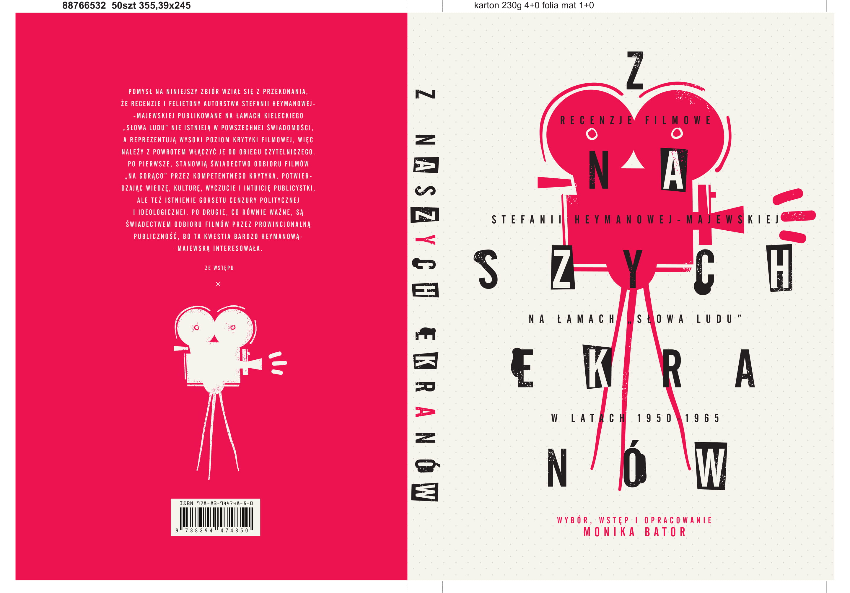 Pomysł na niniejszy zbiór wziął się z przekonania, że wypowiedzi autorstwa Stefanii Heymanowej-Majewskiej publikowane na łamach „Słowa Ludu” poświęcone filmom fabularnym zrealizowanym w Europie Zachodniej i USA, ZSRR oraz w pozostałych krajach Europy Środkowo-Wschodniej pozostających pod dominacją „kraju rad” z Polską włącznie, o ile miały premierę w kieleckich kinach, nie istnieją w powszechnej świadomości, (nie były nigdy przedrukowywane), a reprezentują wysoki poziom krytyki filmowej, więc należy z powrotem włączyć je do obiegu czytelniczego. Po pierwsze, stanowią świadectwo odbioru filmów „na gorąco” przez kompetentnego krytyka, potwierdzając wiedzę, kulturę, wyczucie i intuicję publicystki, ale też istnienie gorsetu cenzury politycznej i ideologicznej. Po drugie, co równie ważne, są świadectwem odbioru filmów przez kielecką publiczność, bo ta kwestia bardzo Heymanową-Majewską interesowała.