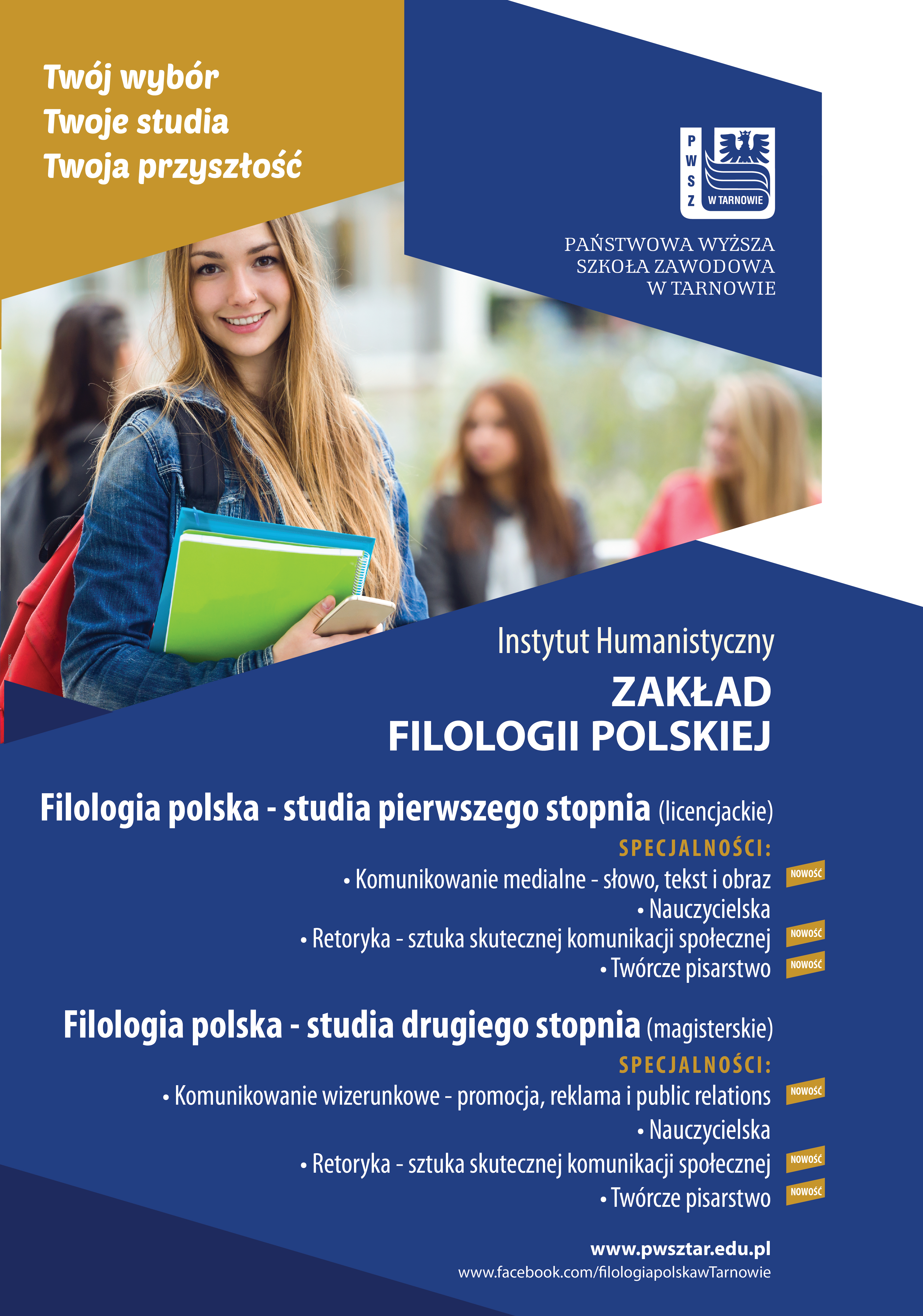 Kierunek filologia polska w PWSZ w Tarnowie prowadzony jest od początku istnienia uczelni, tj. od 1998 roku. Od roku akad. 2017/2018 Zakład Filologii Polskiej PWSZ w Tarnowie wprowadza do oferty studiów na kierunku Filologia polska nowe specjalności. Oprócz cieszącej się popularnością specjalności nauczycielskiej proponujemy specjalności: twórcze pisarstwo (studia pierwszego i drugiego stopnia); retoryka - sztuka skutecznej komunikacji społecznej (studia pierwszego i drugiego stopnia); komunikowanie medialne - słowo, tekst i obraz (studia pierwszego stopnia) i komunikowanie wizerunkowe: promocja, reklama i public relations (studia drugiego stopnia). Kształcenie na kierunku filologia polska w PWSZ w Tarnowie ma charakter praktyczny i odbywa się na podstawie autorskich programów. Zapraszamy do obejrzenia filmów o naszych specjalnościach: http://pwsztar.edu.pl/filologia-polska-nowa-oferta-ksztalcenia/?param=FP Więcej informacji pod linkiem: http://pwsztar.edu.pl/nowe-specjalnosci-kierunki-pwsz/?param=UCZELNIA