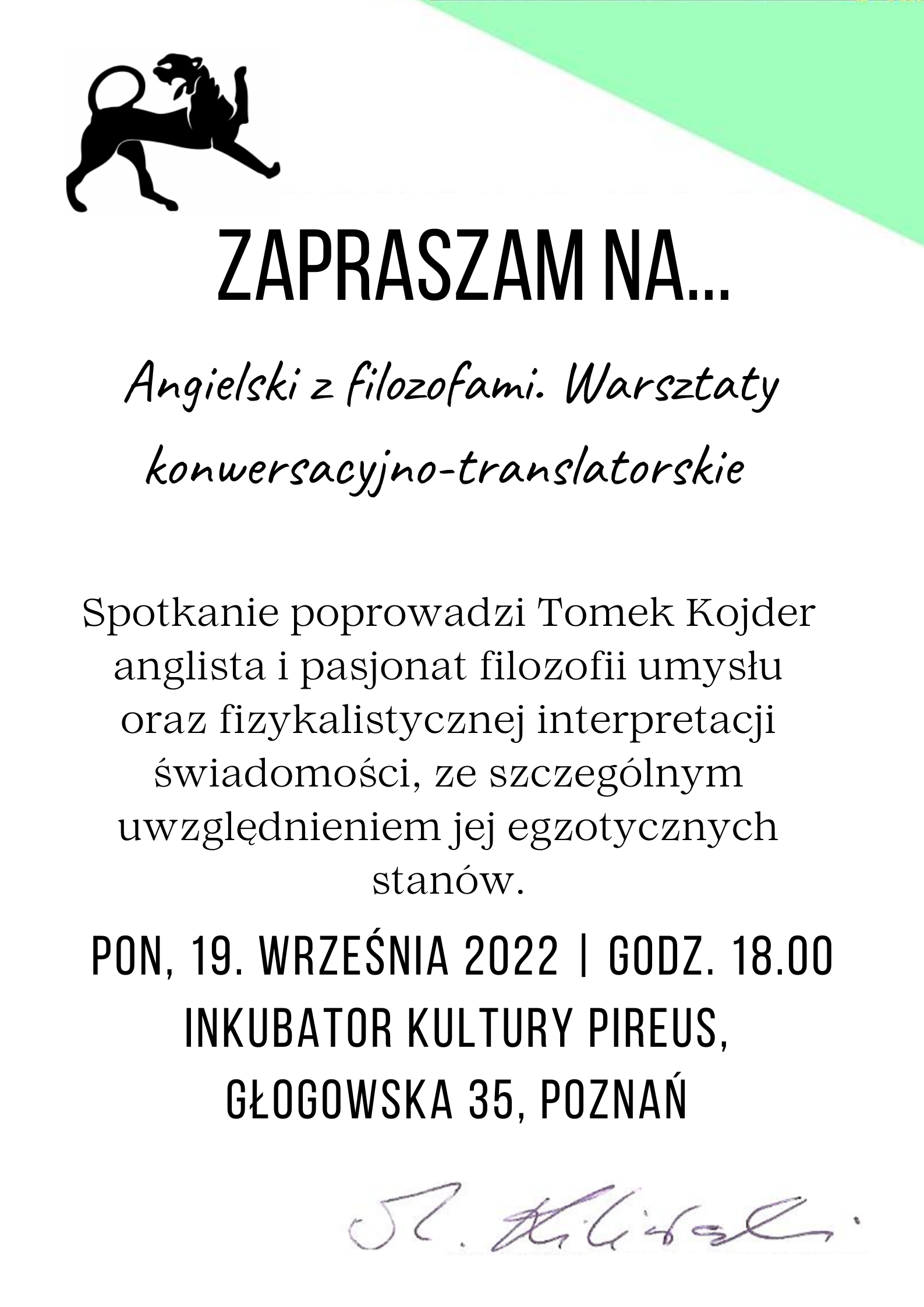Poznański Inkubator Kultury Pireus serdecznie zaprasza na cykl warsztatów konwersacyjno-translatorskich z języka angielskiego w oparciu o teksty z dziedziny filozofii umysłu, neuronauk, transhumanizmu, świeckiego buddyzmu i racjonalnej psychonautyki.