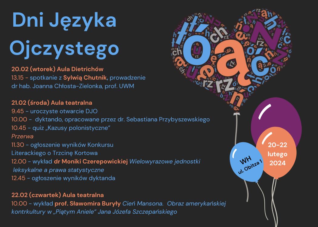 21 lutego (środa) to dzień pod znakiem rozmaitych konkursów – wszyscy, kadra, studenci i uczniowie, będą mogli spróbować swoich sił w dyktandzie, a także w quizie przygotowanym przez studentki filologii polskiej. Ponadto poznamy wyniki Konkursu Literackiego o Trzcinę Kortowa. O 12:00 wykład o wielowyrazowych jednostkach leksykalnych wygłosi dr Monika Czerepowicka.