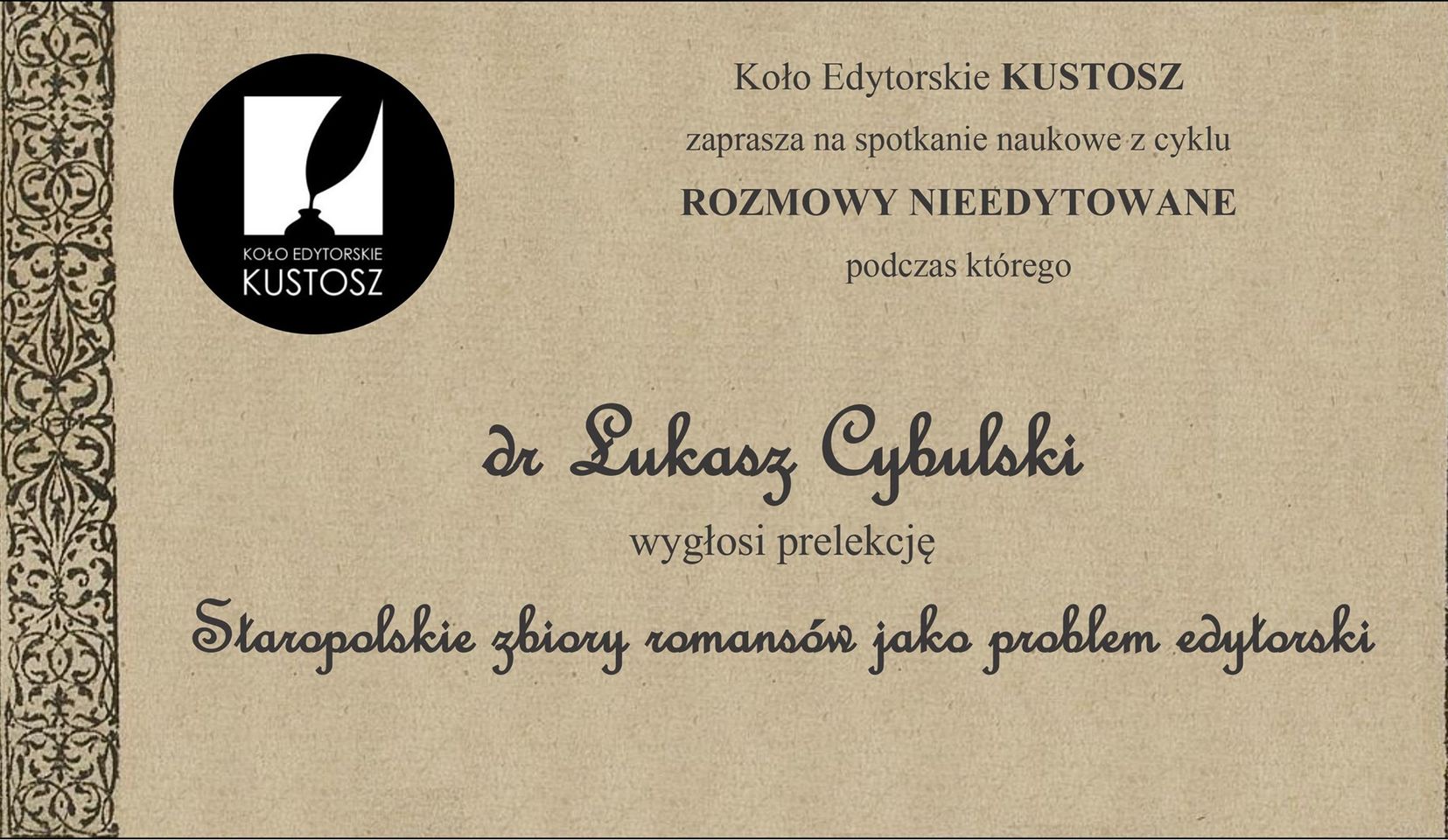 Koło Edytorskie "Kustosz" zaprasza na kolejne spotkanie z cyklu "Rozmowy nieedytowane", w trakcie którego dr Łukasz Cybulski wygłosi prelekcję "Staropolskie zbiory romansów jako problem edytorski".