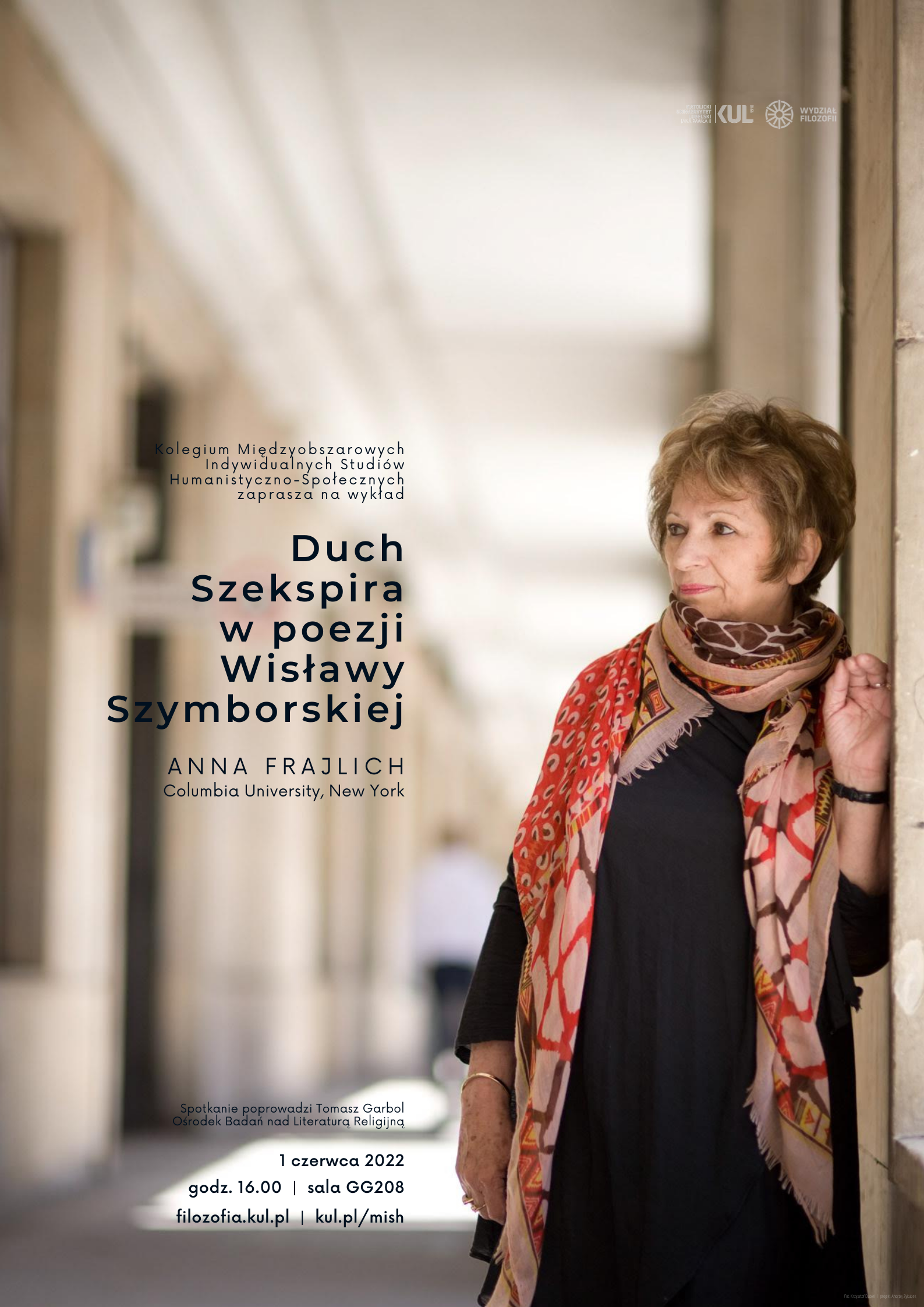 Kolegium Międzyobszarowych Indywidualnych Studiów Humanistyczno-Społecznych KUL zaprasza na spotkanie z poetką Anną Frajlich (Columbia University, New York). Spotkanie, które odbędzie się 1 czerwca 2022 r. o godz. 16:00 w sali GG-208 poprowadzi prof. Tomasz Garbol, dyrektor Ośrodka Badań nad Literaturą Religijną KUL.