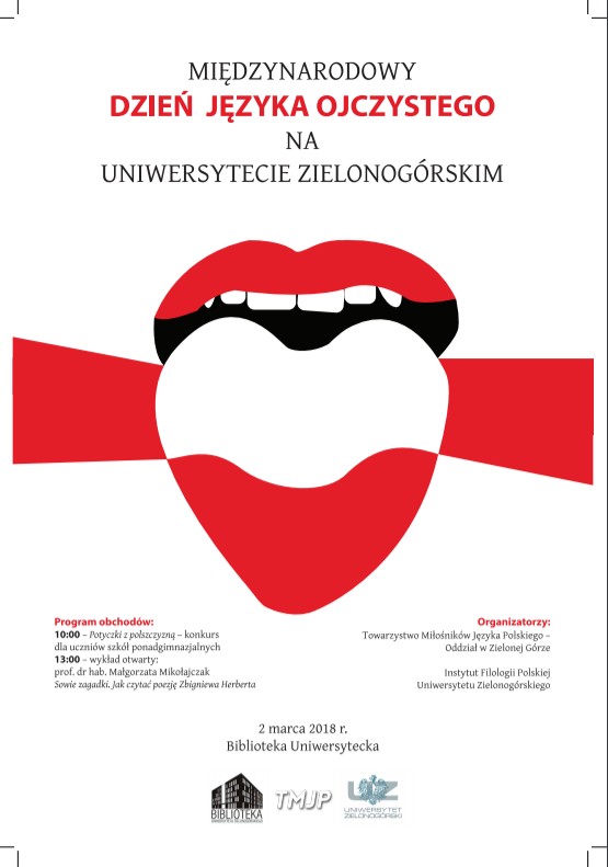 Towarzystwo Miłośników Języka Polskiego oddział w Zielonej Górze i Instytut Filologii Polskiej Uniwersytetu Zielonogórskiego zapraszają na obchody Międzynarodowego Dnia Języka Ojczystego.