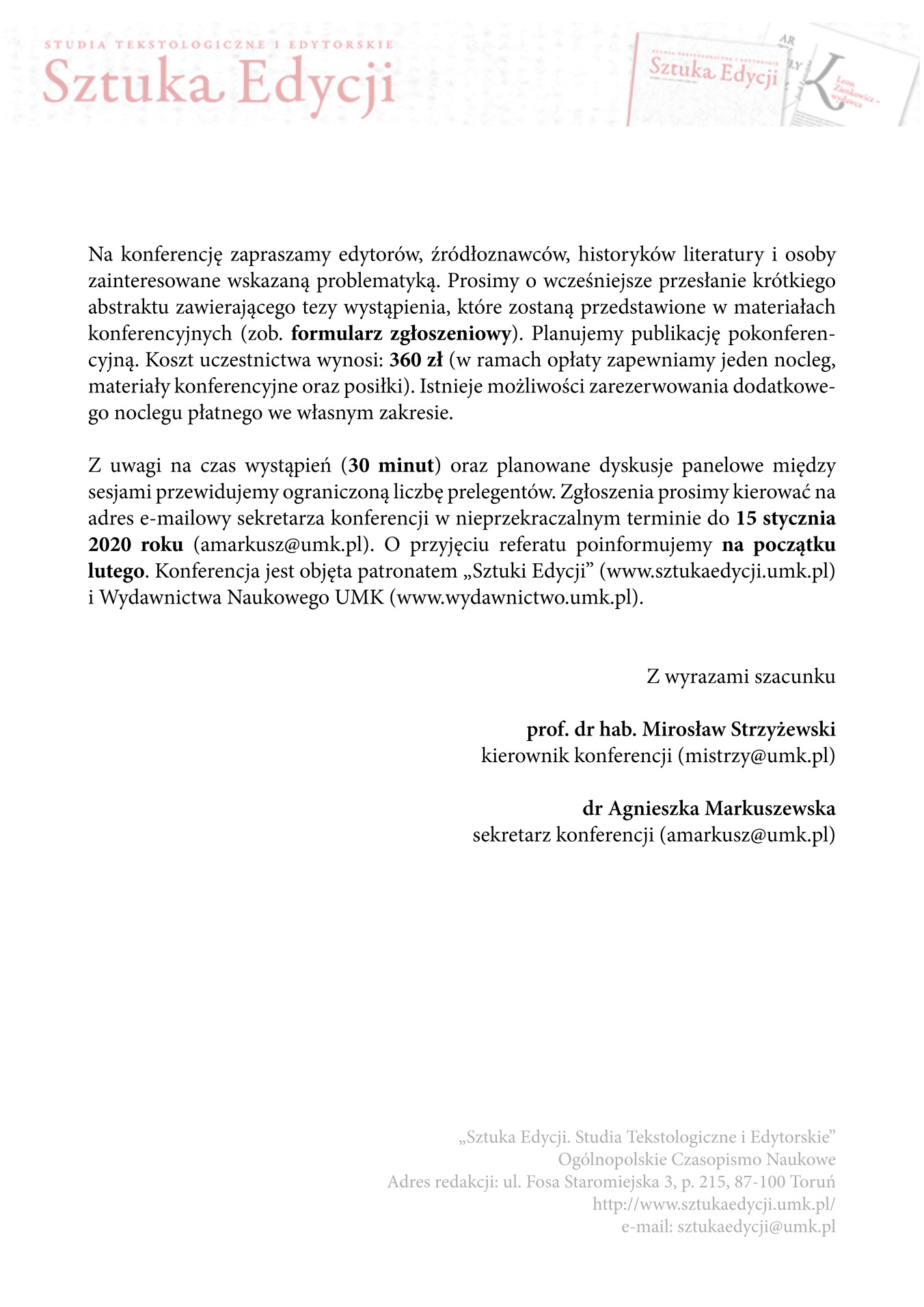 Konferencja odbędzie się na Wydziale Humanistycznym Uniwersytetu Mikołaja Kopernika w Toruniu w dniach 14-15 maja 2020 roku.
