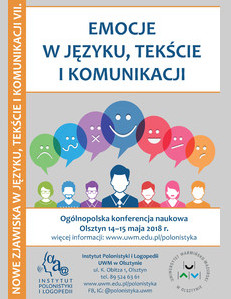 Serdecznie zapraszamy na 7. ogólnopolską konferencję z cyklu „Nowe zjawiska w języku, tekście i komunikacji”, która odbędzie się w dniach 14-15 maja 2018 r. w Instytucie Polonistyki i Logopedii Uniwersytetu Warmińsko-Mazurskiego w Olsztynie. Tym razem naukową refleksją pragniemy objąć status emocji we współczesnej komunikacji oraz sposoby ich przejawiania się w różnego rodzaju tekstach.