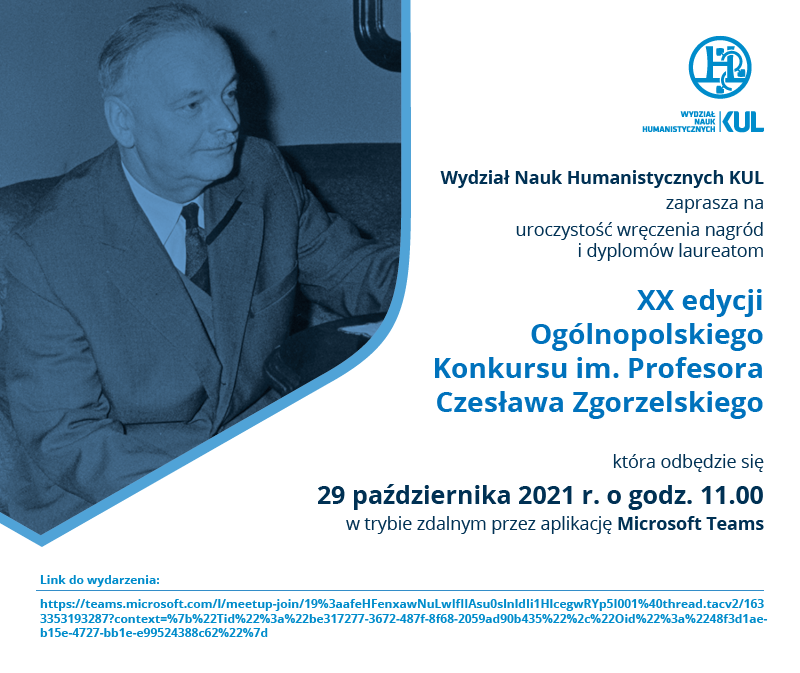 Uroczystość wręczenia nagród i dyplomów laureatom XX edycji Ogólnopolskiego Konkursu im. Czesława Zgorzelskiego odbędzie się 29 października 2021 roku o godzinie 11.00. Gospodarzem uroczystości jest Wydział Nauk Humanistycznych KUL, odbędzie się ona w trybie zdalnym.