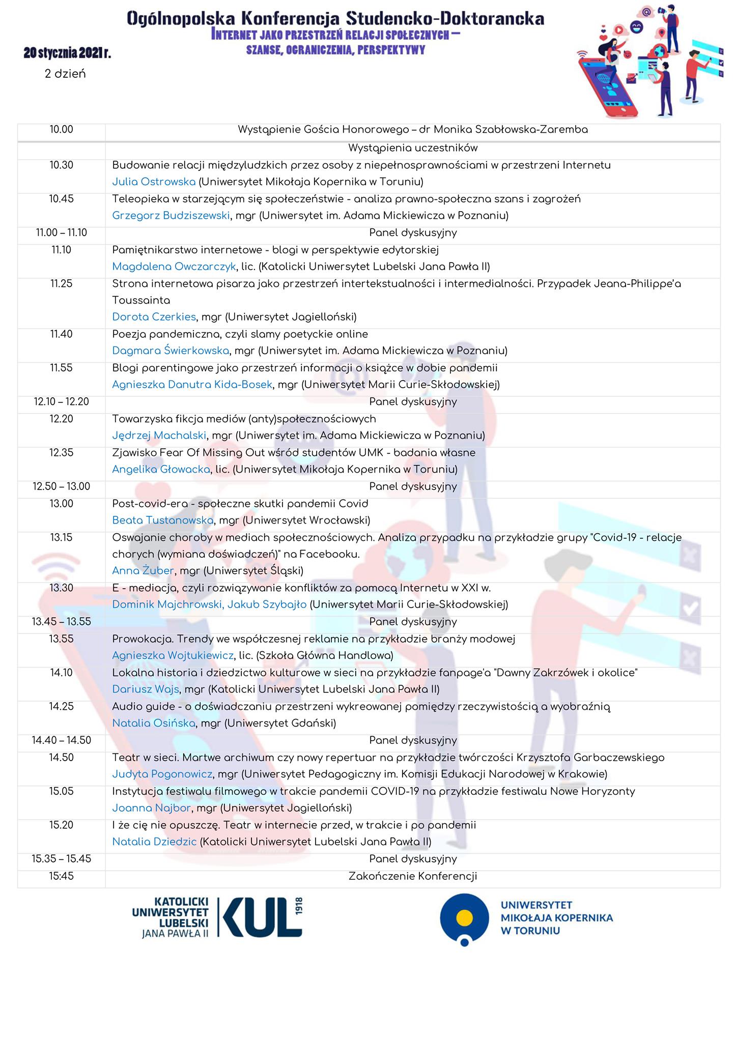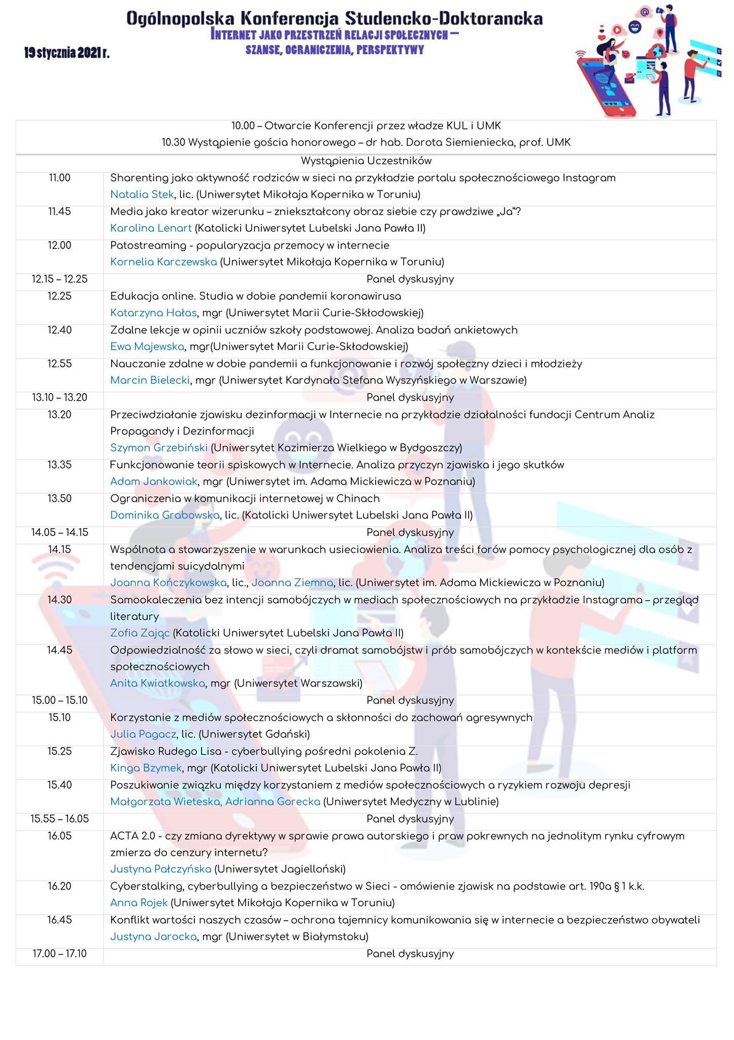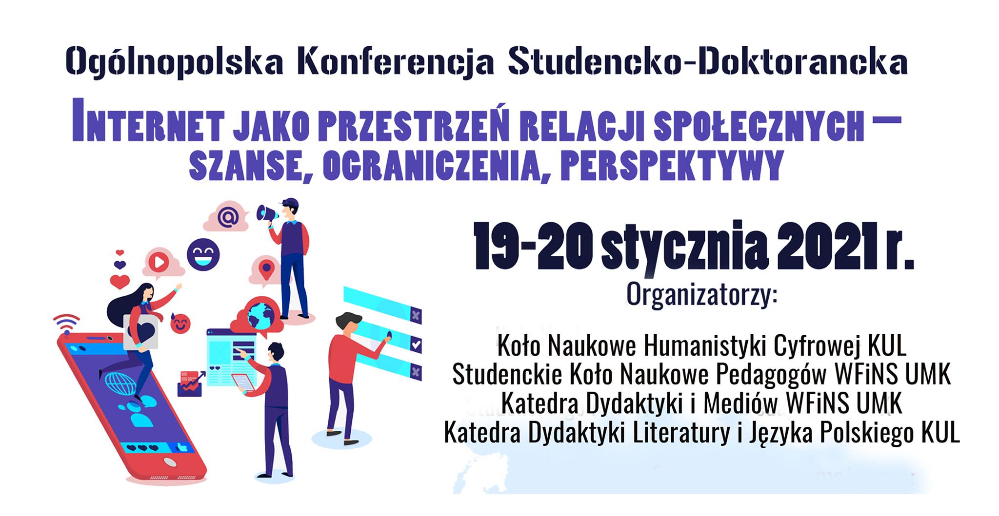 - 19-20 stycznia 2021 r. – Ogólnopolska Konferencja Studencko-Doktorancka Internet jako przestrzeń relacji społecznych – szanse, ograniczenia, perspektywy