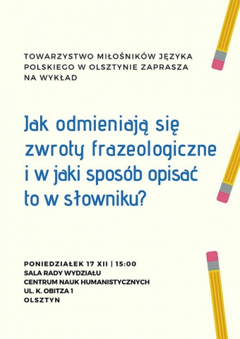 Badacze z Instytutu Polonistyki i Logopedii UWM w Olsztynie przedstawią referat „Jak odmieniają się zwroty frazeologiczne i w jaki sposób opisać to w słowniku?”. Spotkanie odbędzie się w poniedziałek (17 XII 2018) w godz. 15.00-16.30 w sali Rady Wydziału, w Centrum Nauk Humanistycznych, ul. K. Obitza 1.