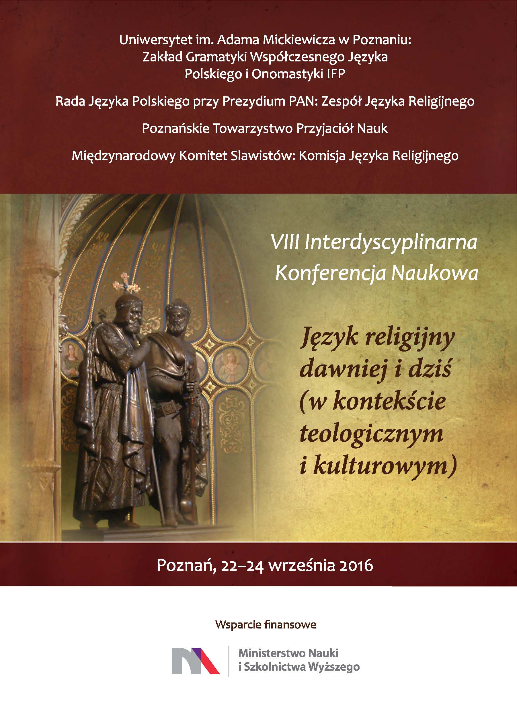 Zakład Gramatyki Współczesnego Języka Polskiego i Onomastyki IFP UAM, Poznańskie Towarzystwo Przyjaciół Nauk, Zespół Języka Religijnego Rady Języka Polskiego przy Prezydium PAN, Komisja Języka Religijnego Międzynarodowego Komitetu Slawistów mają zaszczyt zaprosić na VIII Interdyscyplinarną Konferencję Naukową Język religijny dawniej i dziś (w kontekście teologicznym i kulturowym), która odbędzie się w dniach 22 – 24 września 2016 roku na Wydziale Filologii Polskiej i Klasycznej UAM (ul. Fredry 10) i w siedzibie PTPN (ul. Mielżyńskiego 27/29).