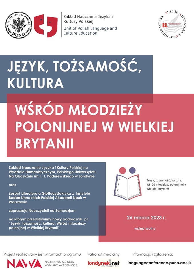 Zakład Nauczania Języka i Kultury Polskiej na Wydziale Humanistycznym Polskiego Uniwersytetu na Obczyźnie im. I.J. Paderewskiego w Londynie oraz Zespół "Literatura a Glottodydaktyka" Instytutu Badań Literackich PAN zapraszają nauczycieli na sympozjum, na którym przedstawiony zostanie nowy podręcznik pt. Język, tożsamość, kultura. Wśród młodzieży polonijnej w Wielkiej Brytanii.