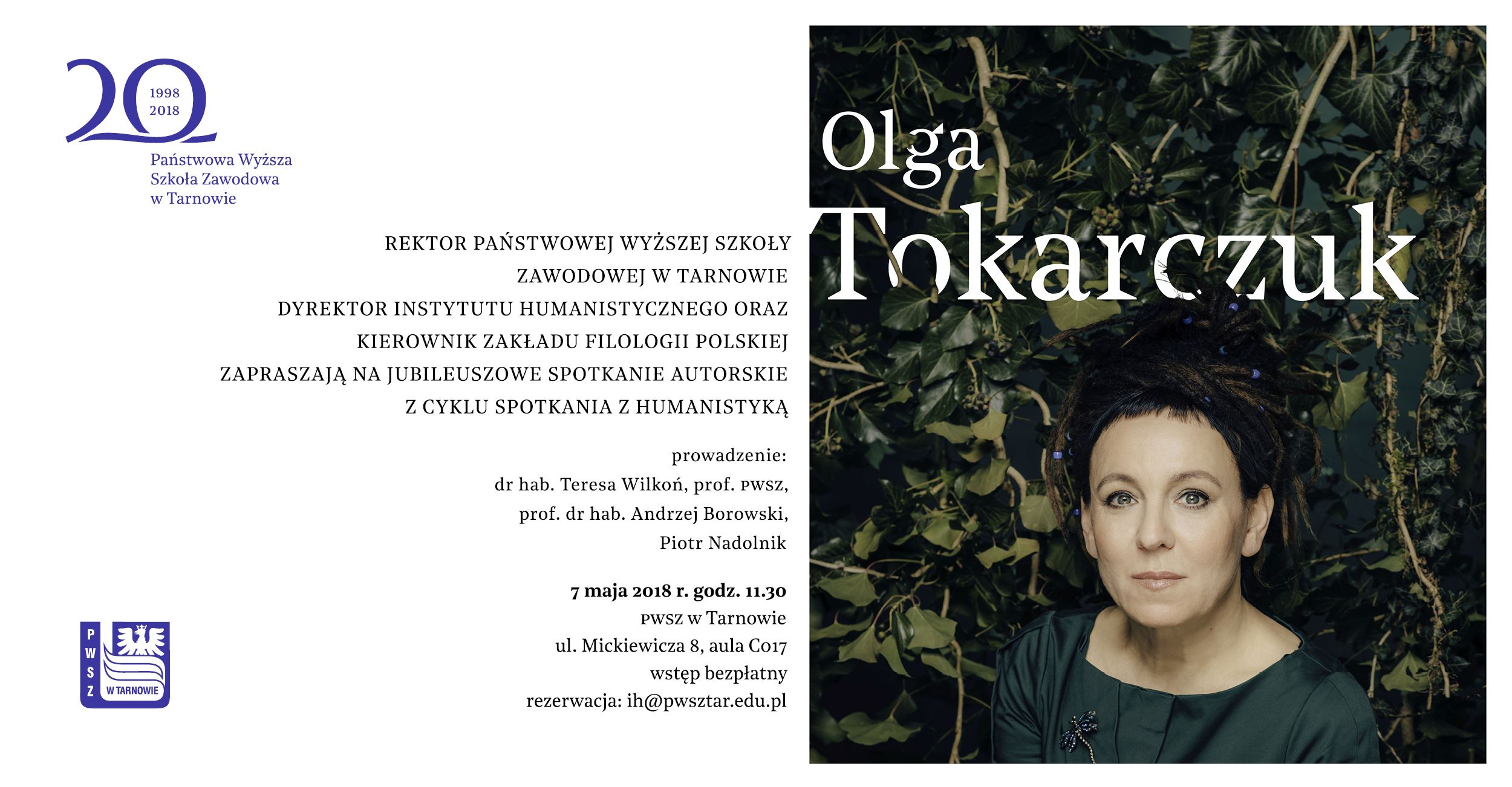 Rektor Państwowej Wyższej Szkoły Zawodowej w Tarnowie, Dyrektor Instytutu Humanistycznego oraz Kierownik Zakładu Filologii Polskiej zapraszają na spotkanie autorskie z Olgą Tokarczuk.